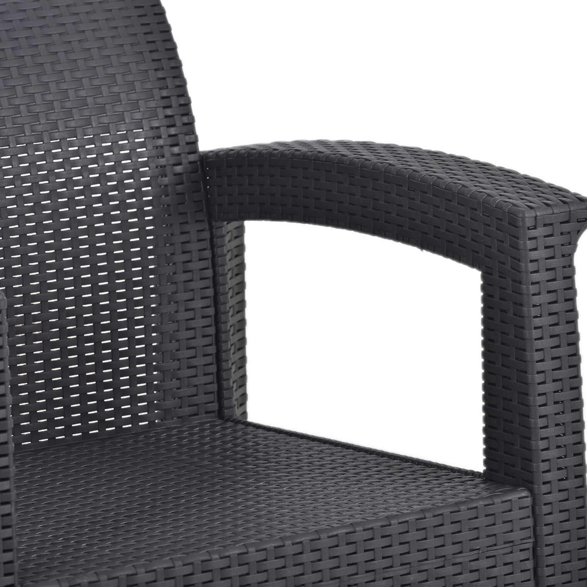 ◆ 02リアルに透け感まで再現:ラタンの風合いを、樹脂成型でリアルに再現します。全体に施された籐編みのようなテクスチャ一は模様には隙間があり透け感があるのでよりリアルです。座面に水がたまらない利点もあります。