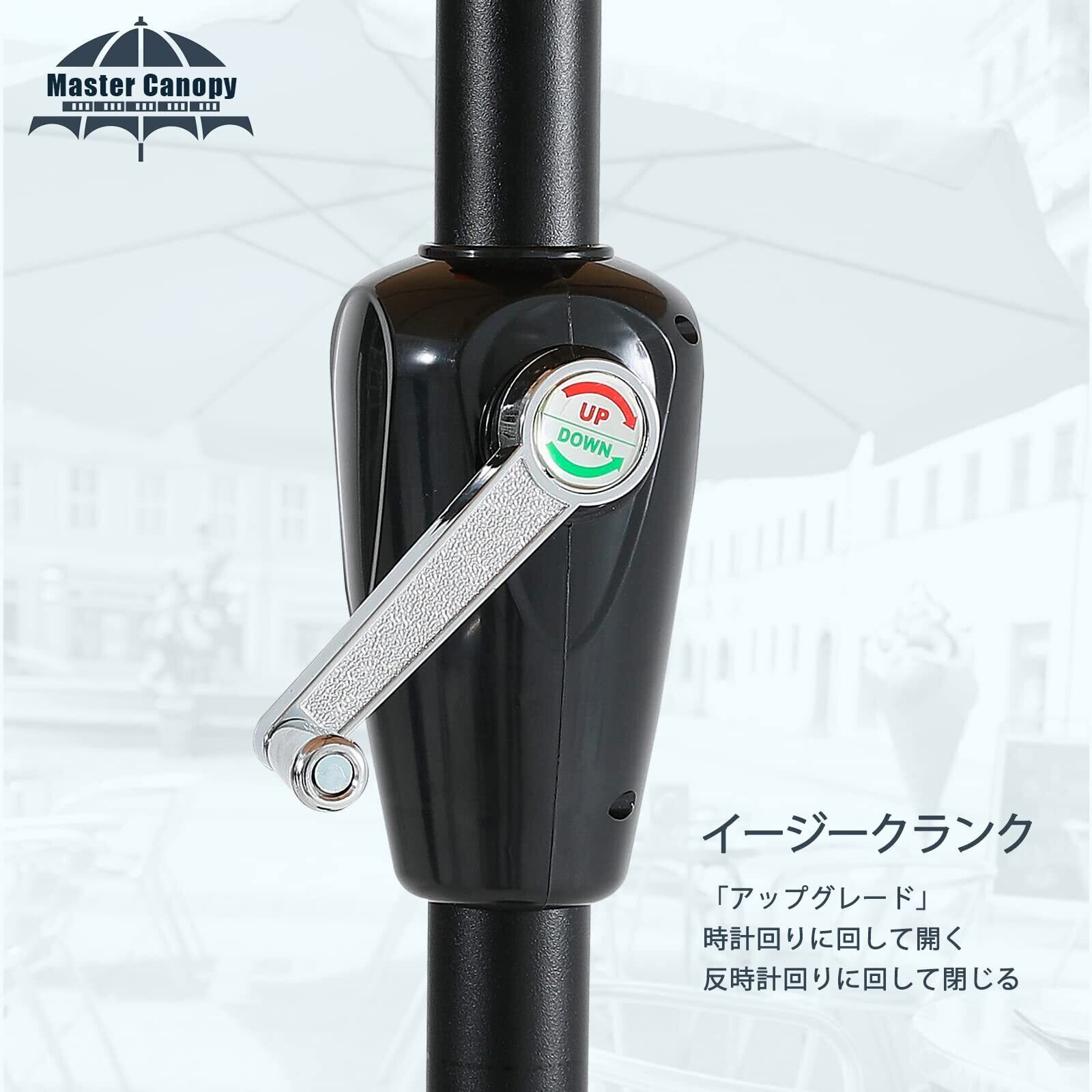 使いやすい機能性:パティオテーブルに合わせた太めのポールで安定感があり、ハンドルを回すだけで簡単に開閉できます。チルト機能で日差しの角度に合わせて調節可能。女性やご年配の方でも無理なく操作できる、使いやすさを追求しました。