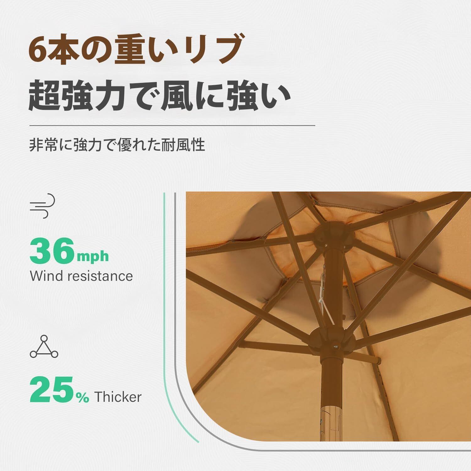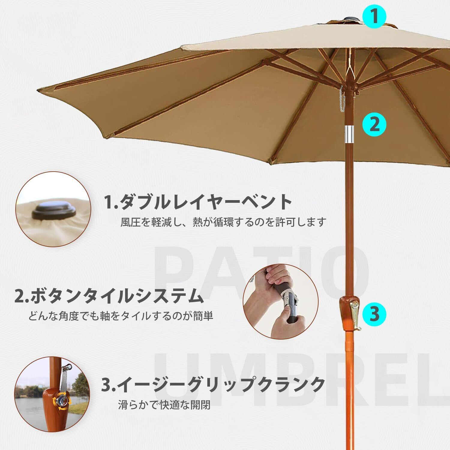 ️【回転ハンドル】:パラソル回転しやすいハンドルを備えており、簡単に開閉できます。また、傾斜ボタンで傘の角度を調整し、さまざまな日光角度で最適な日除け効果を得ることができます。