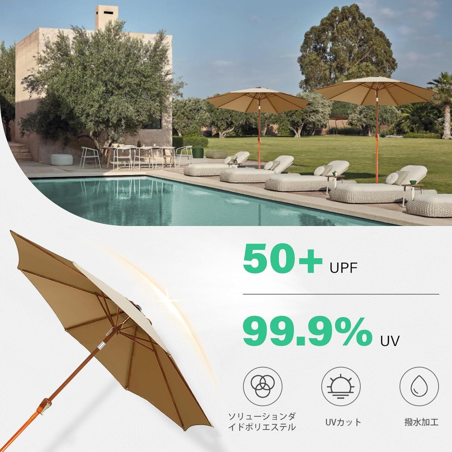 ️【防水・UVカット】:ガーデンパラソル高品質のポリエステル+PU素材を使用し、優れた防水性とUVカット機能を備えています。紫外線を効果的に遮断し、安全で健康的な日除け体験を提供します。