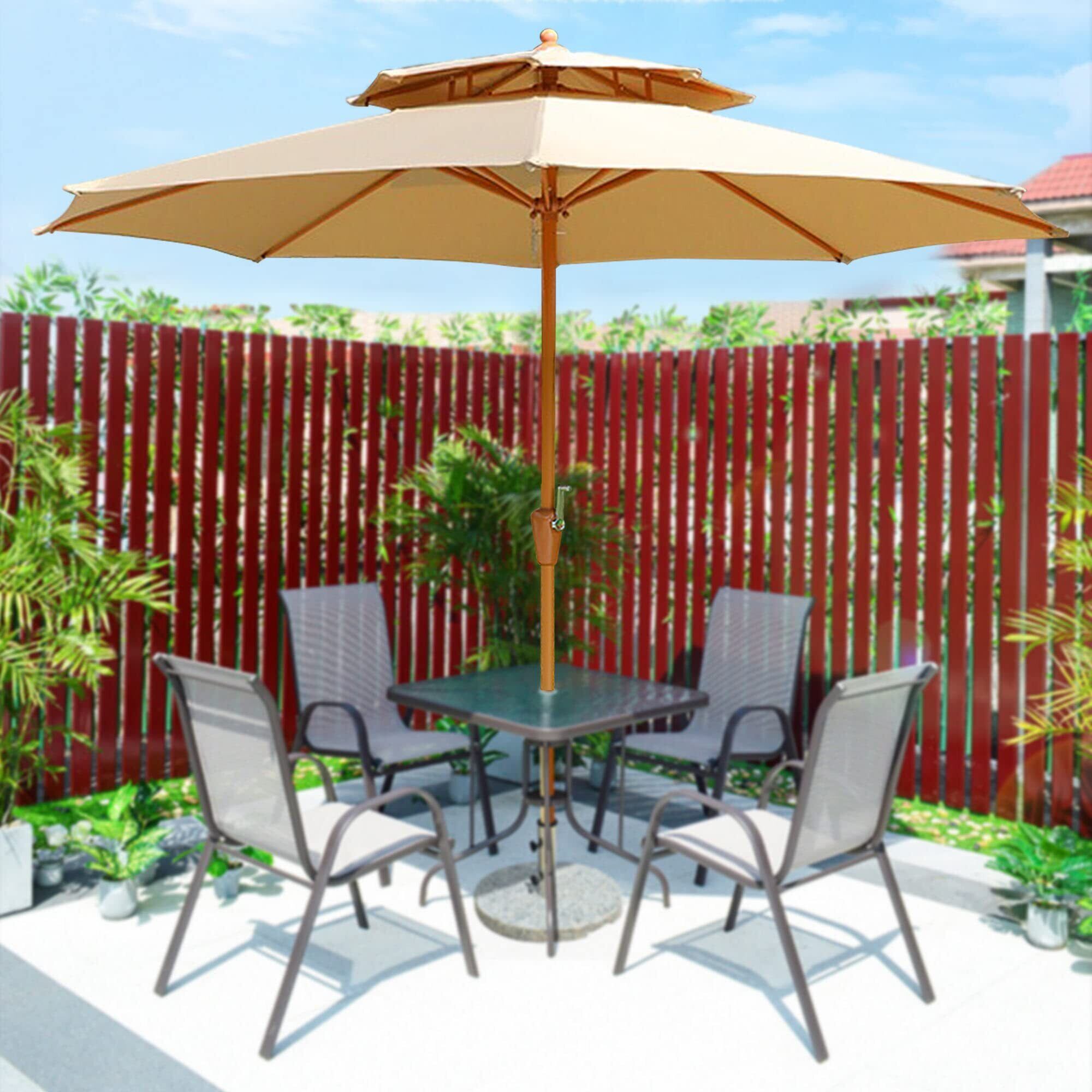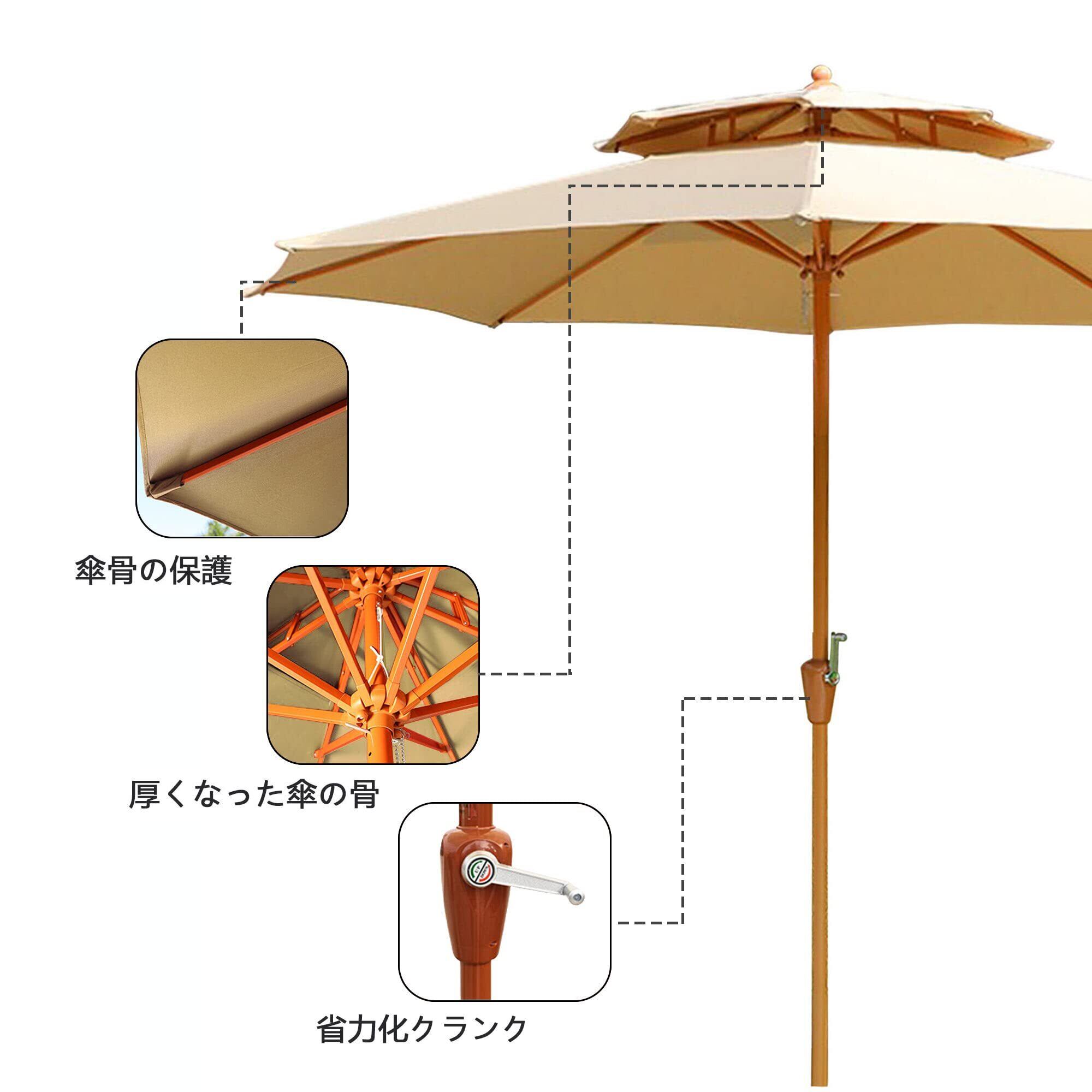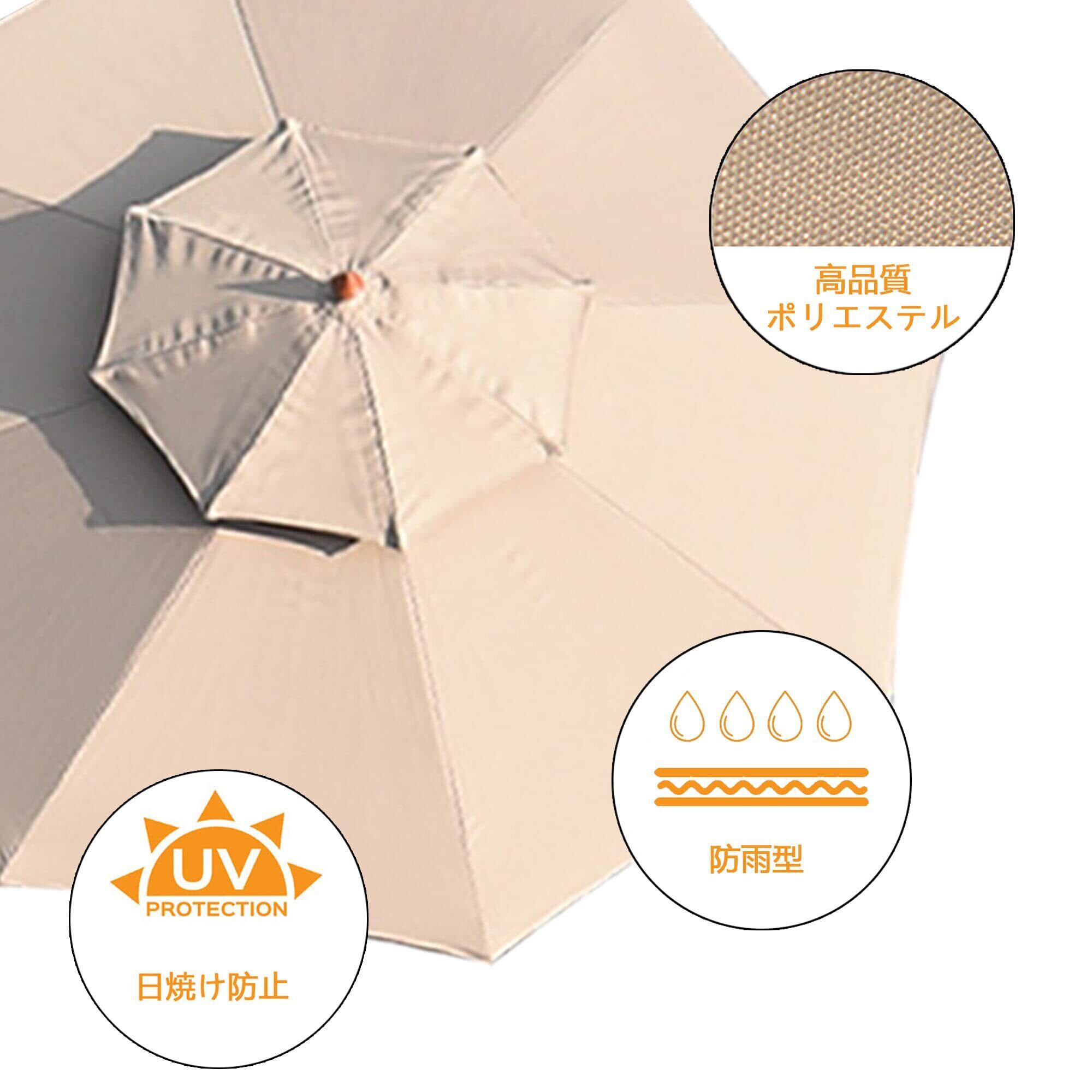【双頂構造は風に強い】私たちのガーデンパラソルは、独自のガーデンパラソル構造を採用しており、優れた抗風性能を提供します。二重層のパラソルは風の衝撃を効果的に軽減し、強風の日でもパラソルを安定させ、より安定した安全な遮蔽体験をお約束します。