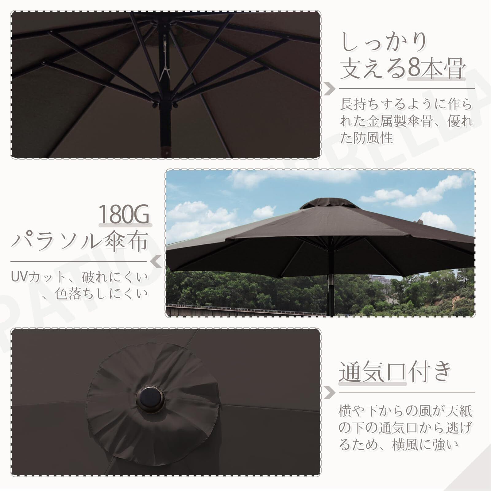 DEWEL パラソル ガーデンパラソル 風に強い UVカット 角度調整可能 日除け 撥水加工 折りたたみ 簡単開閉 ビーチパラソル 鉄製 アウトドア ビーチ キャンプ 庭 テラス ベランダ ガーデニング バルコニー(ブラウン,270cm)