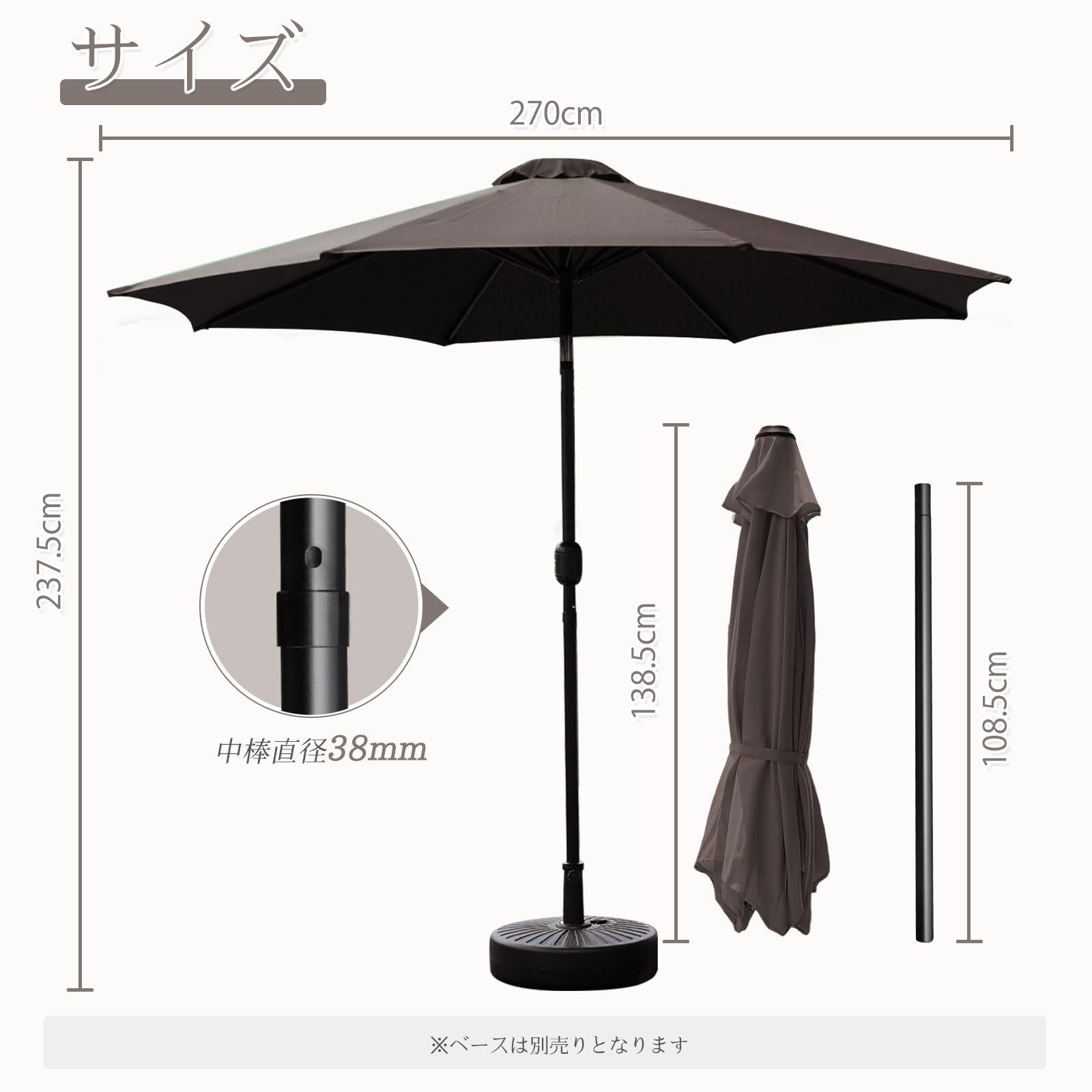 【商品仕様】:「サイズ」直径270cm×高さ237.5Cm 「中棒の直径」38mm 「傘生地」180Gポリエステル 「傘骨」8本 *ディスプレイや写真の光の加減や角度により実物の色が多少異なる場合があります。ご注意:本製品はパラソル本体のみ、ベースは別売りです。