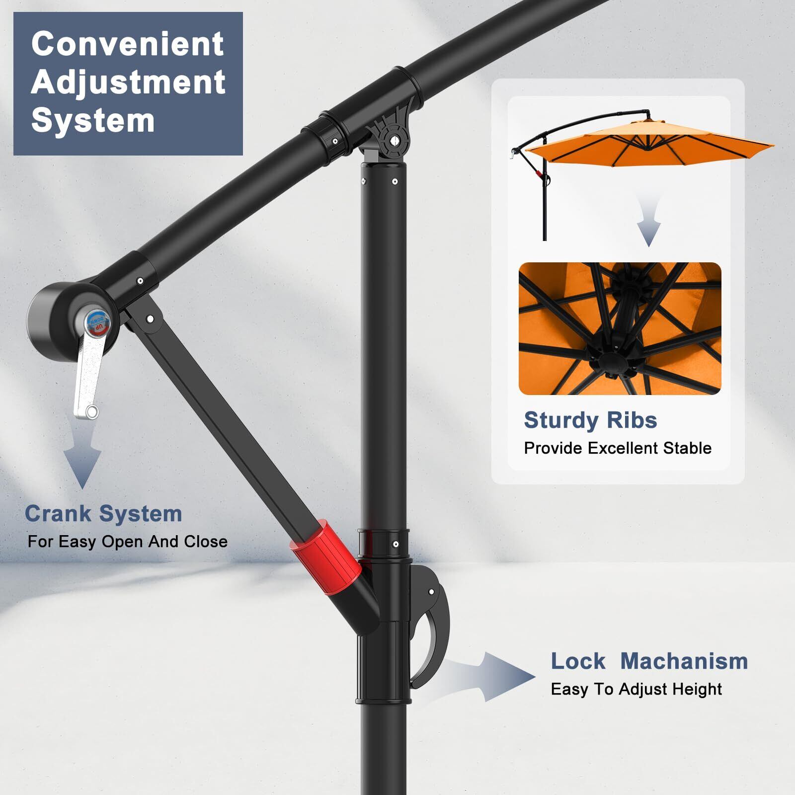 【操作簡単なハンドル回転式】: こちらのハンドルは簡単に開閉できます。ハンドルを回すだけで、力が強くない方も簡単展開できます。折りたたみ式のデザインで、使わない時も庭の一隅に収納でき、省スペースなガーデンパラソルです。