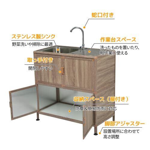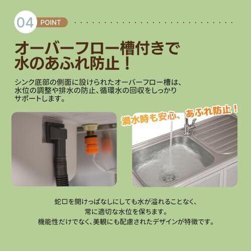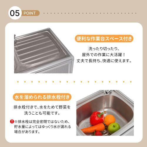 ◎01【お庭に調和するシンプルなデザイン】アルミ素材とシルバー系の色合いで、無機質すぎずおしゃれ感。アルミ素材と温かみのある木目調で、ナチュラルな雰囲気にも馴染むやさしい。 ◎02【庭先に設置すれば、洗い物や作業がぐんとラクに。】(庭先での洗い物)(家庭菜園やガーデニング後の手洗い)(外作業後の手洗い)(BBQ) ◎03【囲い付きでスッキリ!ステンレス製流し台】アルミ製の囲いパネルでしっかり目隠し。外から見えてほしくない物もすっきり隠せます。収納しやすく、見た目もきれい!囲い付きの2段棚で、洗剤やバケツなどを使いやすく収納でき、まわりも清潔感のある印象に。(各段耐荷重20kgで、たっぷり収納OK!) ◎04【届いたその日からすぐに組立可能必要部品すべて付属! 】蛇口 排水栓 排水ホース 給水ホース(変換アダプター付き) ゴムハンマー 軍手 ◎05【細部までこだわった設計】サビに強いステンレス製屋外にそのまま置いても安心のステンレス素材を採用。サビに強く、長く清潔に使えます。 ◎06【水を溜められる排水栓付き】排水栓付きで、水をためて野菜を洗うことも可能です。※排水栓は完全密閉ではないため、貯水量によってはゆっくり水が漏れる場合があります。 ◎07【深型シンクでしっかり洗える】深さのあるシンクで、水の飛び散りを抑えながらしっかり洗浄。屋外でも快適に使える設計です。 ◎08【 高さ調整できるアジャスター付き】設置場所のわずかな傾きにも対応でき、安定して設置できます。 ◎09【オーバーフロー槽の機能】シンク底部の側面に設けられたオーバーフロー槽は、水位の調整や排水の防止、循環水の回収をしっかりサポートします。蛇口を開けっぱなしにしても水が溢れることなく、常に適切な水位を保ちます。機能性だけでなく、美観にも配慮されたデザインが特徴です。