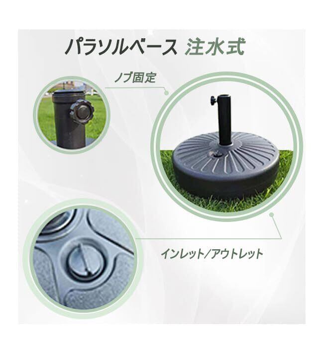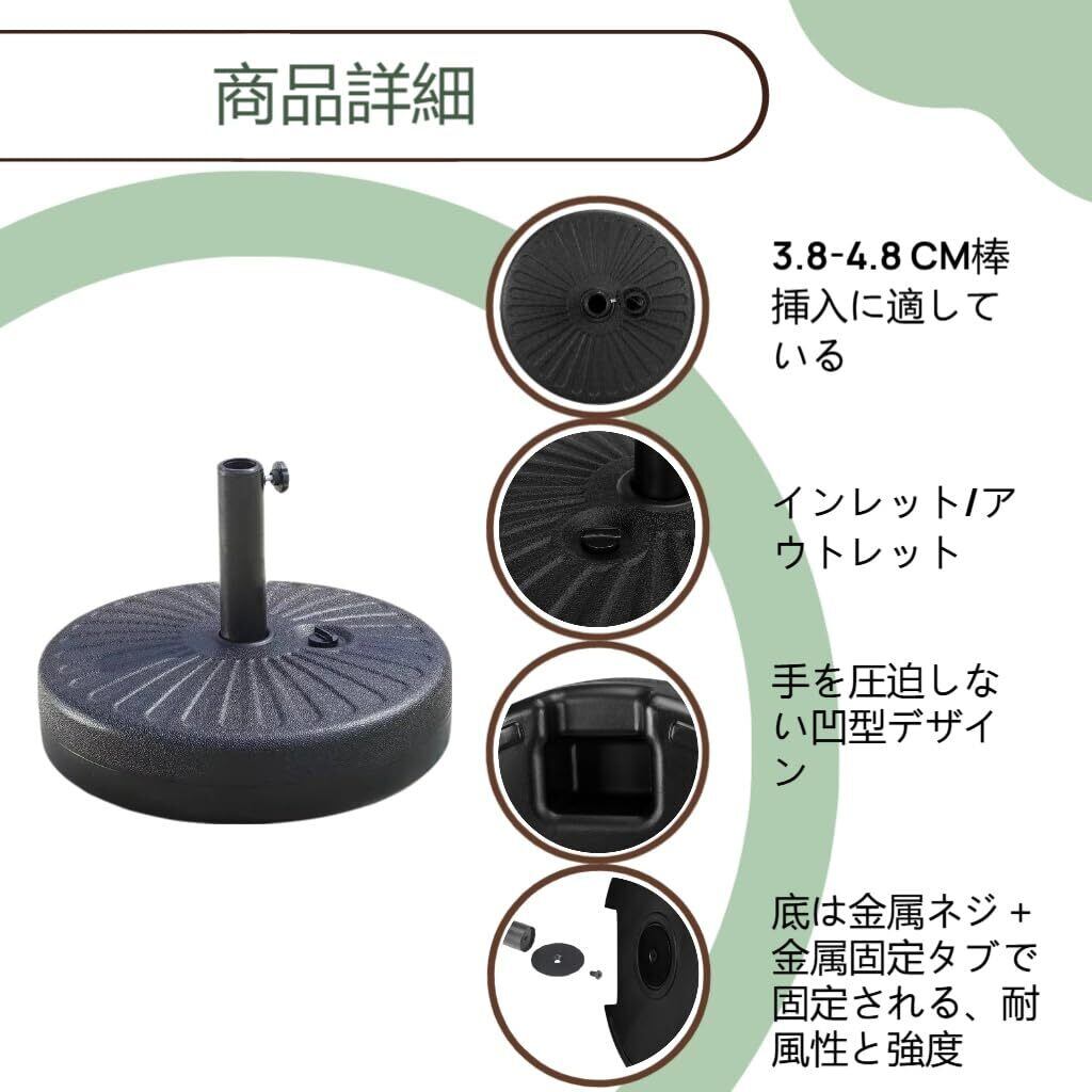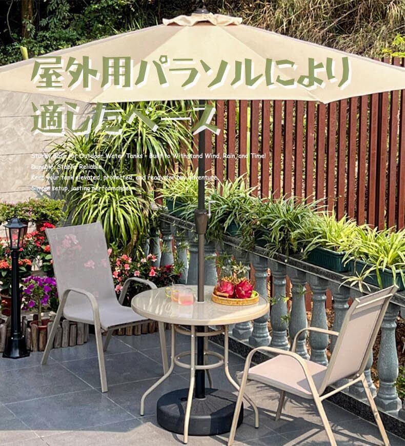 商品情報:このガーデンアンブレラベースのサイズは51*12CMで、210CM以上の大きな傘に適しています。控えめなブラックのデザインは、ガーデンやバルコニーのインテリアに自然に調和します。22リットルの大容量なので、砂を入れて安定性を高めることができます。砂を入れることで、ベースの重量が増し、強風でもパラソルがひっくり返ることがなくなります。