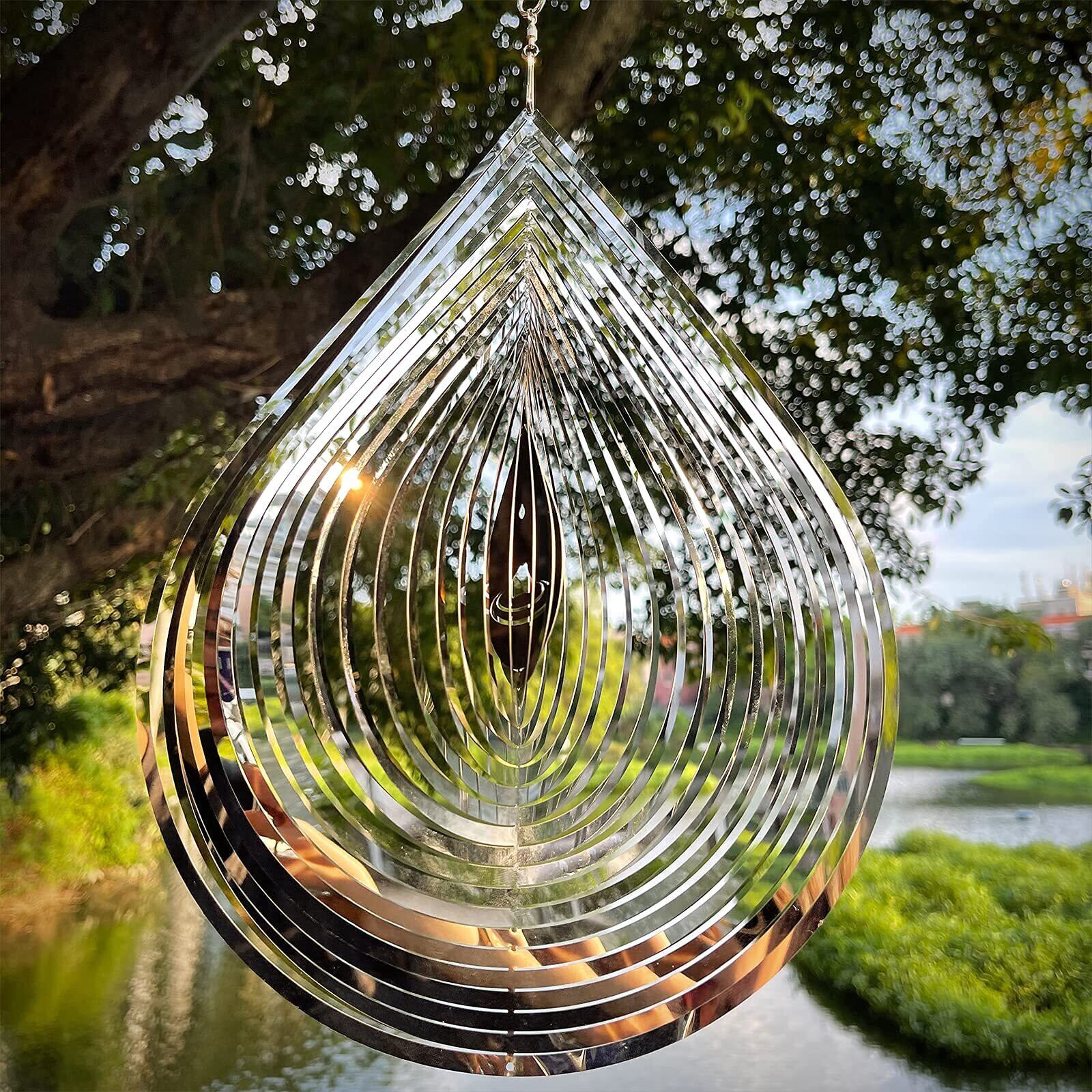 ウィンドスピナー 3D 水滴型 反射率の高いステンレススチールメタル屋外ガーデン装飾、庭の鳥を追い払う装飾12インチ