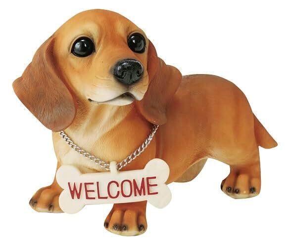 ウェルカムボードを首から提げた犬の置物
