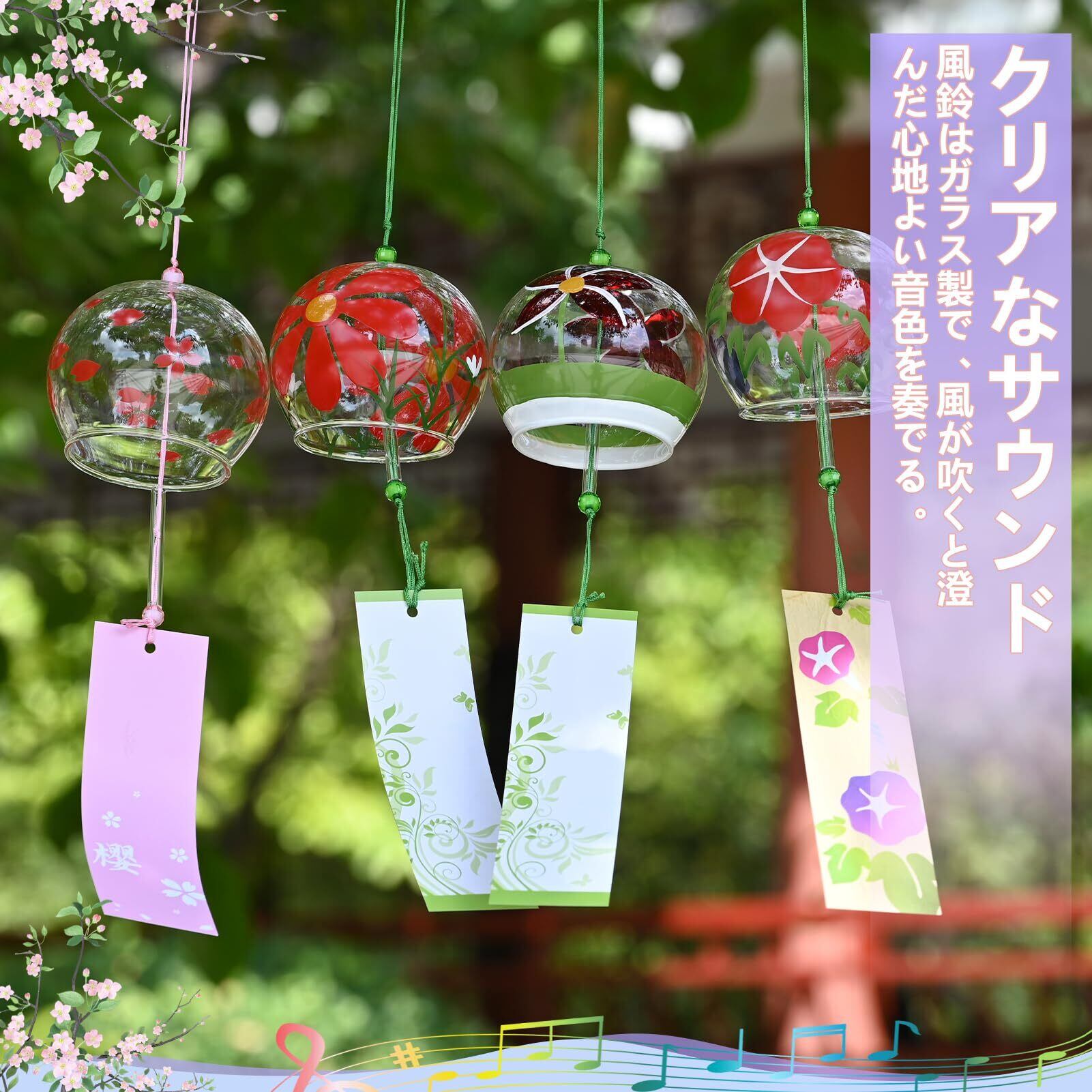 風鈴 手作り風鈴 4点セット ガラス 江戸 癒しの音 涼しい感じ 夏の風物 幸運 夏の風物詩 カラフル おしゃれ インテリア おみやげ 雰囲気作り 屋根飾り ギフト 贈り物 インテリア 和風 短冊付き (赤い菊+アサガオ+赤い花+レッド桜) | KSショップ