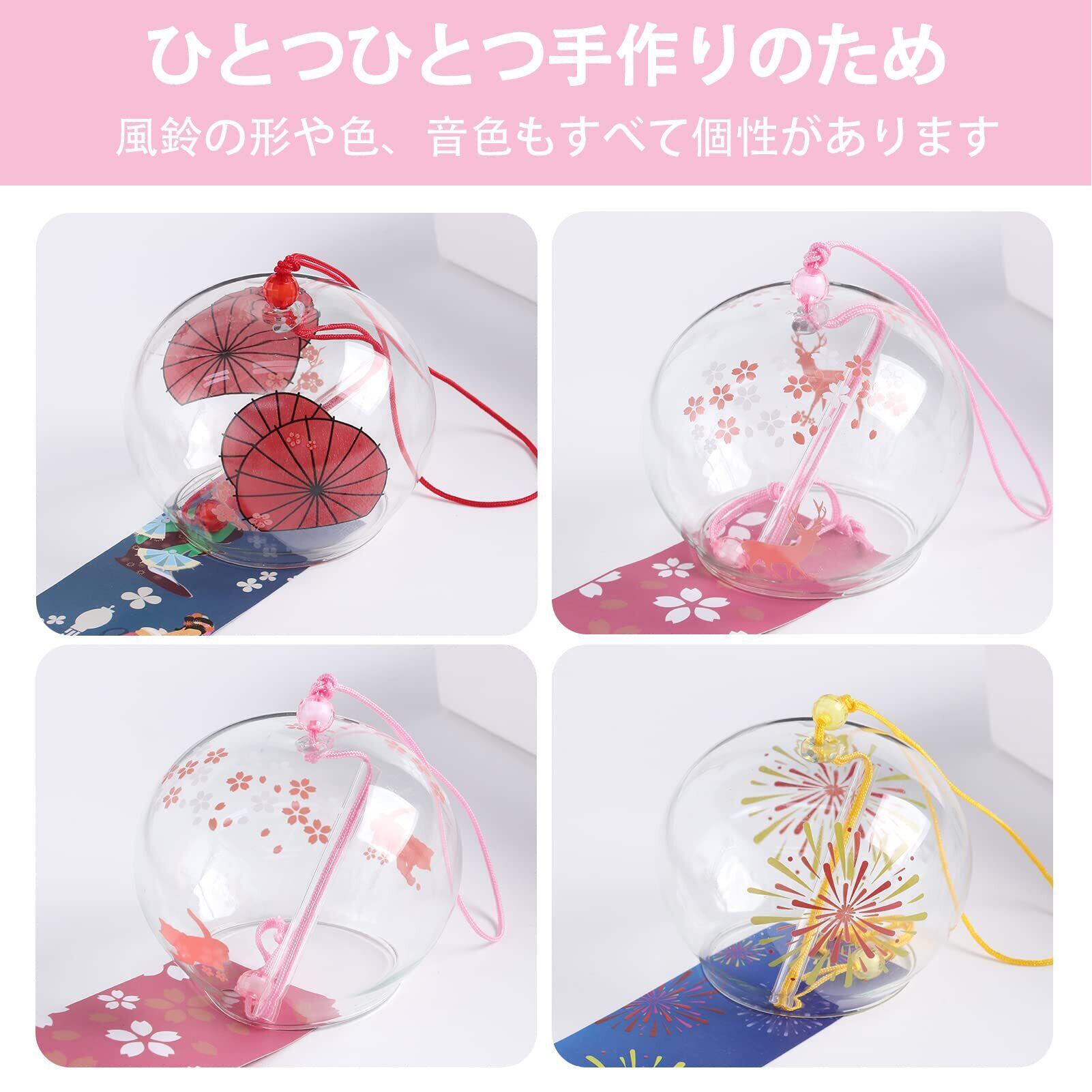 【製品仕様】主な素材は高ホウケイ酸ガラスで、強度が高く、硬度が高く、透過率が高いの特徴があり、風鈴が透明でクリアになります。4個セット(傘+花柄&鹿+花柄&猫+花火)。和風風鈴、手吹きガラスの風鈴で、精緻な手描きと美しい花柄が描き込まれています。おしゃれな装飾で、様々なスタイルで、夏にぴったりです。職人が手作りで、サイズや色、柄に軽微な誤差がある場合があります。