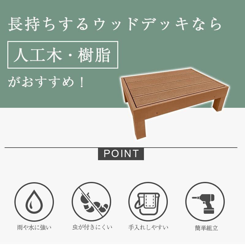●木と樹脂を配合した人工木だから、見た目は木っぽいにも関わらず、樹脂製なので、耐久性に優れており、ウッドデッキによくある腐敗にも強い
