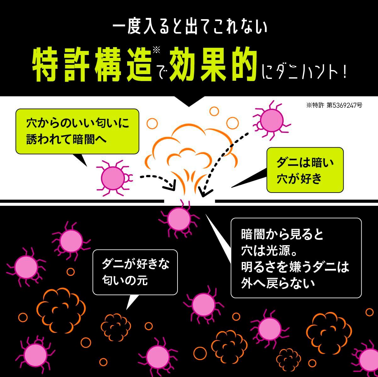 【ダニの習性を徹底研究した構造】ダニハンターDXの「ダニ取りシート」は、匂いと暗がりに誘われてダニが入り込む仕組み。中から見ると穴は光源となり、明るさを嫌うダニは一度中に入ると戻れなくなります。