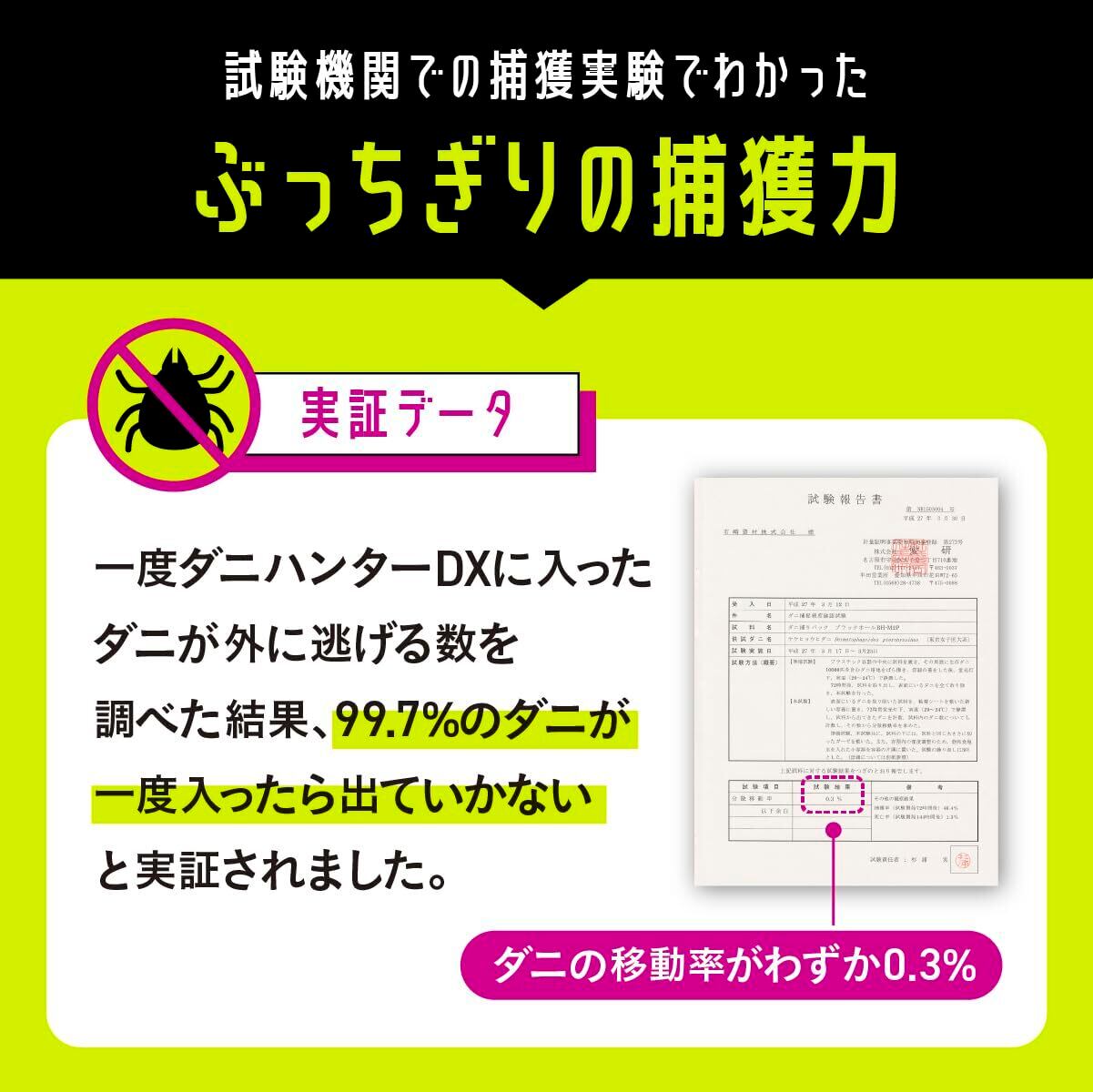 【ダニ取りシート 驚異の閉込率99.7%】取得( 第5369247号)の特殊構造のダニ取りシートで、ダニを逃しません!調査の結果、99.7%のダニが一度入ったら出ていかないと実証されました。