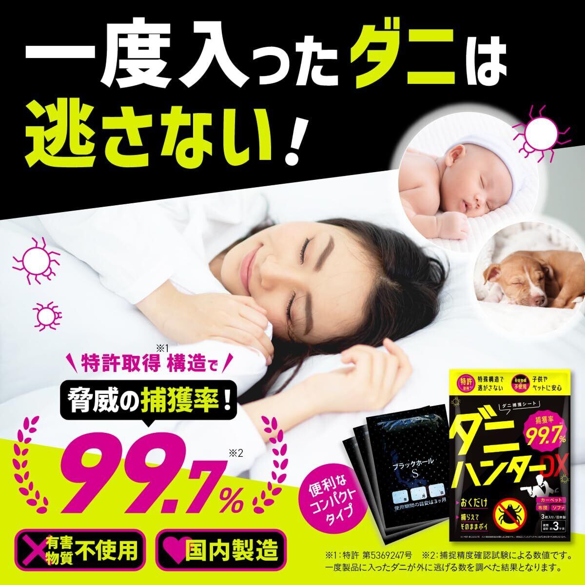 【子どもやペットがいても安心】誘引物は食品同等の安全な成分で構成しており、殺虫剤などは使用しておりません。有害物質不使用&国内製造でダニ駆除ができるから、赤ちゃんや犬・猫などのペットがいるご家庭でも安心安全です。
