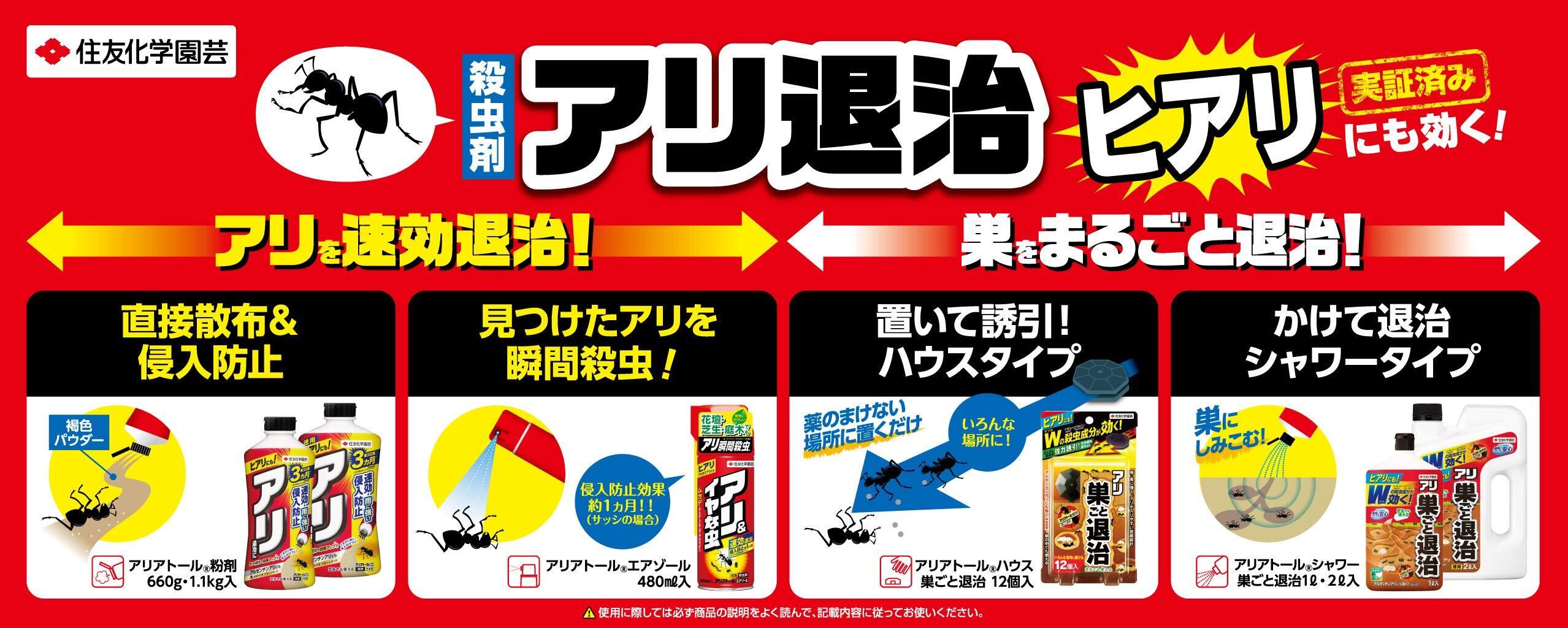 アリは仲間同士で触れ合う習性があり、その習性によって巣の中で行き来するアリに効果がどんどん広がり、巣をまるごと退治します。