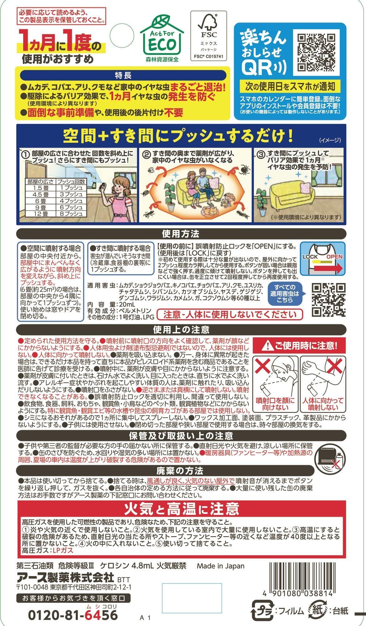 虫コロリアース 1プッシュ式スプレー 害虫駆除スプレー 80プッシュ ムカデ コバエ アリ 害虫 駆除