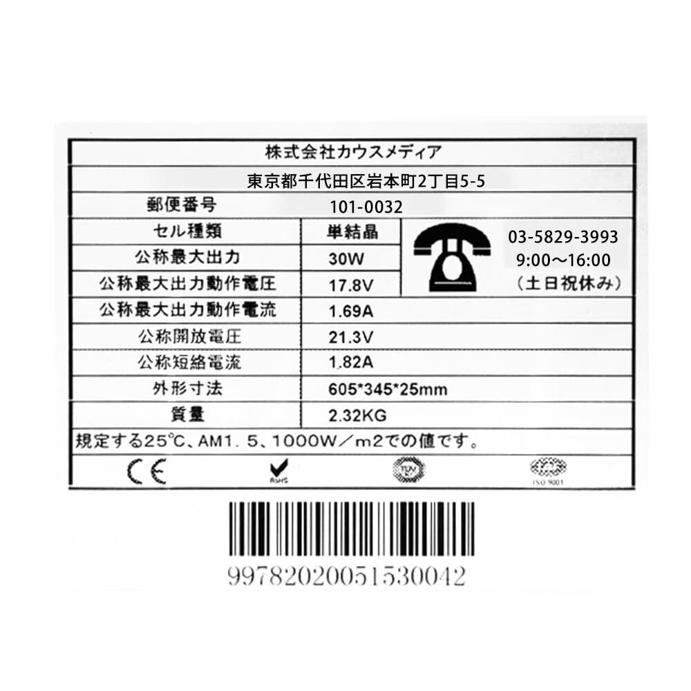 30W 単結晶 ソーラーパネル アルミフレーム