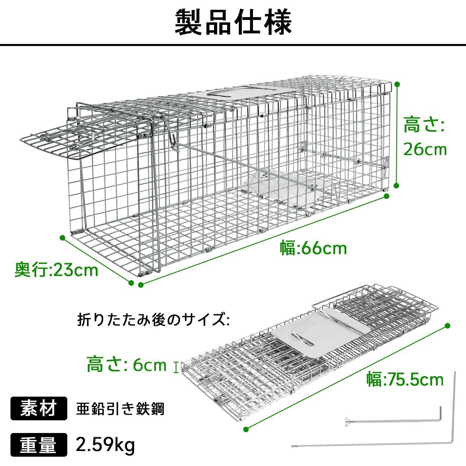 【農作物の害獣対策にもオススメ】 猫 捕獲器 サイズ :66cm×.26cm×23cm 農作物の害獣被害にお悩みの方にもオススメです。持ち運びもしやすく畑などに簡単に設置できます。猫捕獲器 高品質の鉄製、錆びにくく、丈夫で、耐候性があり屋外でも使用可能。