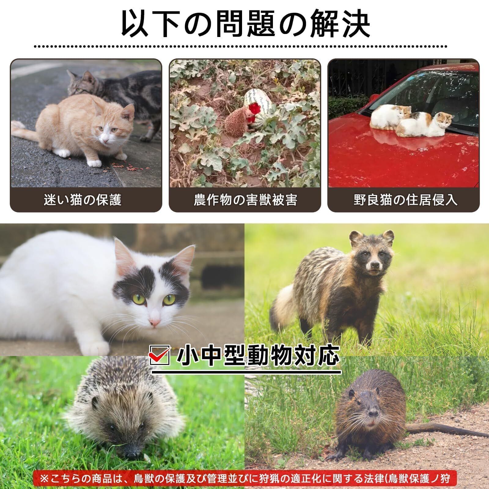 【野良猫や迷子猫の保護に】 この製品は、弱い立場の野良猫や迷い家猫を保護するために使用することができます。 また、脱走したペットを傷つけることなく捕獲・保護します。 菜園、畑、果樹園、林などに設置でき、アライグマ、イタチ、ビーバーなどテンなどの害獣から畑を守ります。