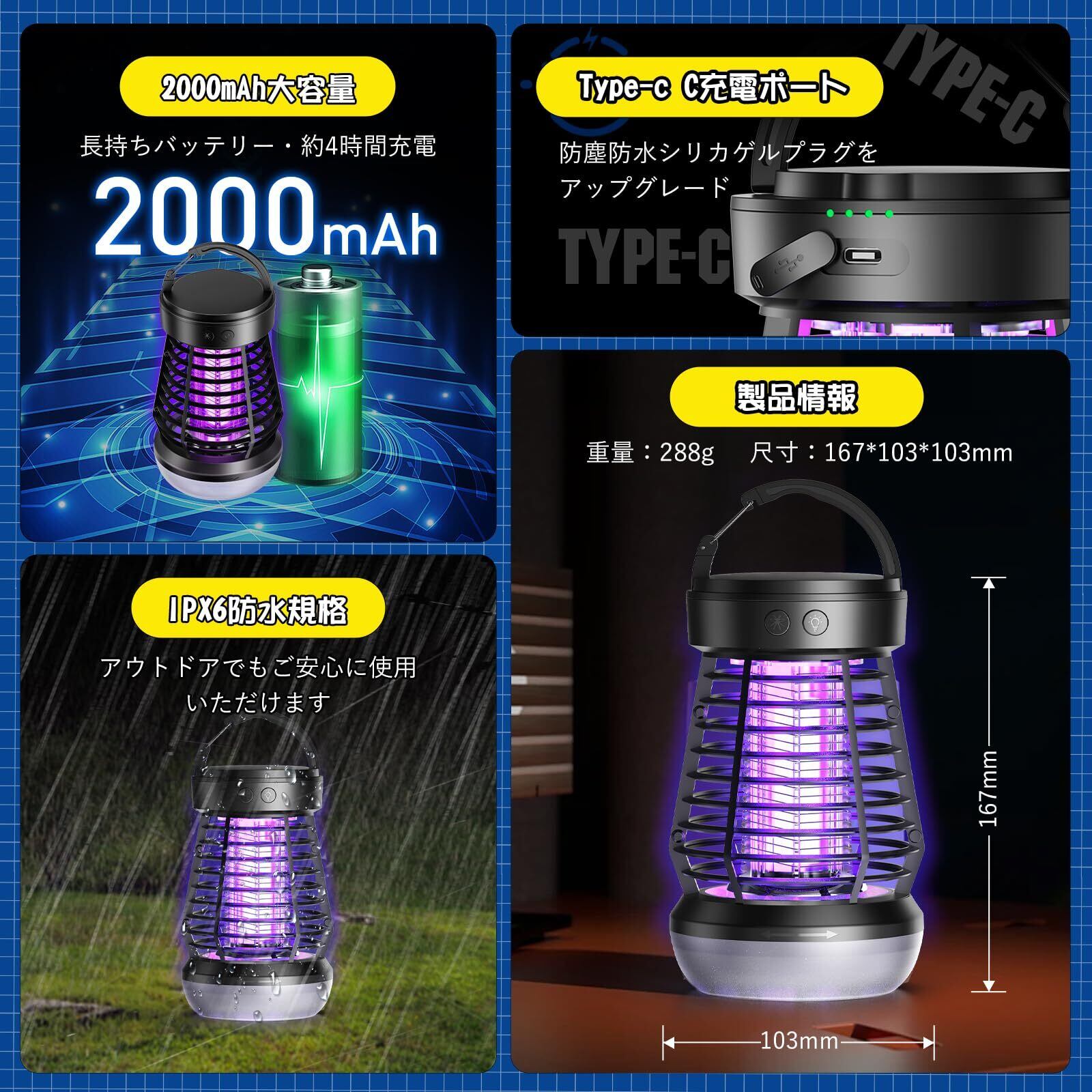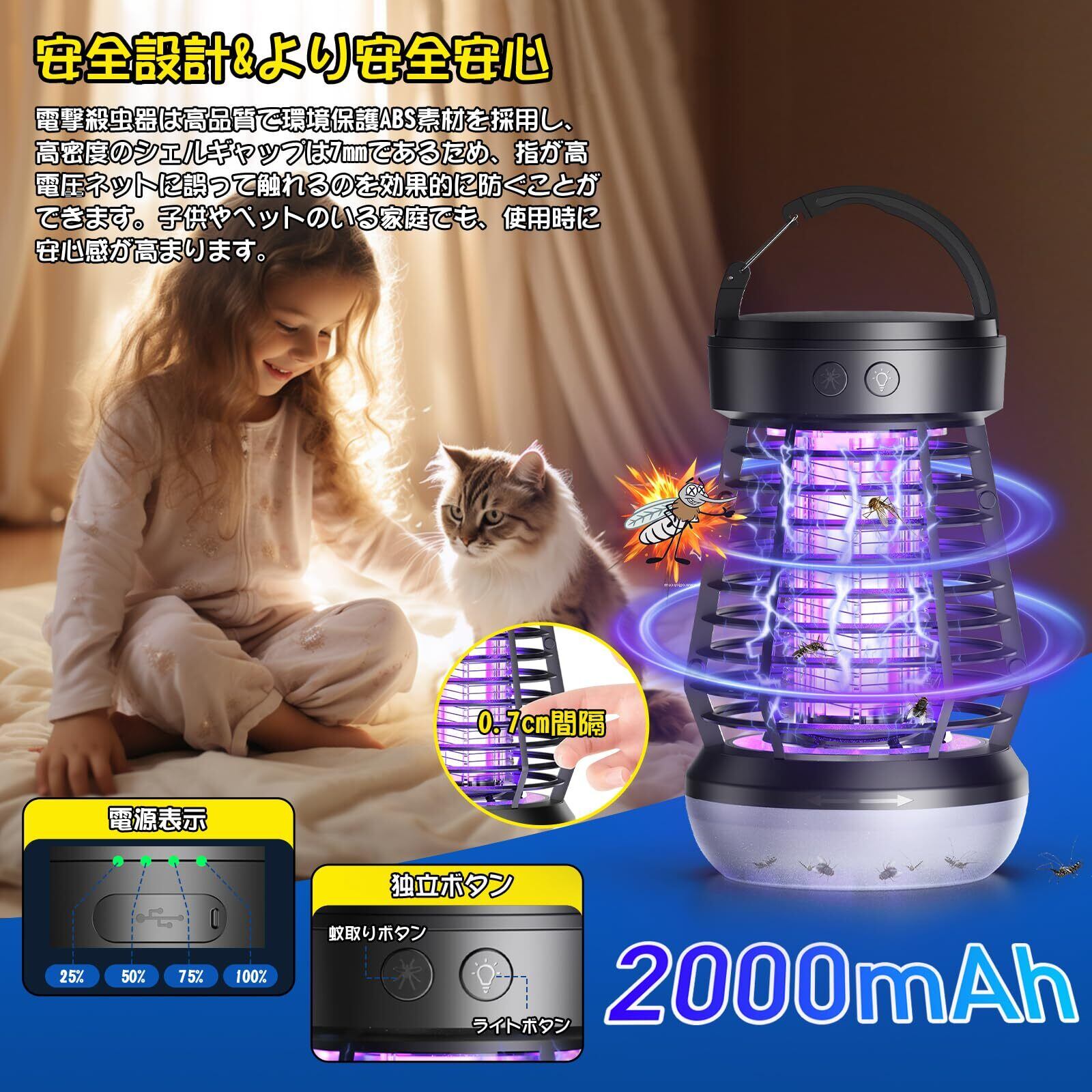 【両用設計・幅広い用途・IPX6防水】吊り下げ式&据え置き式両用設計、庭に吊り下げも可能、室内据え置きもでき、便利にご使用いただけます、操作が簡単で。様々な場所で適用されます!◆家庭用:庭、台所、ベランダ、キャンプ、トイレ、犬小屋、など。◆室外用:夜釣り、キャンプ、登山、旅行など。◆業務用:食料品店、食堂、民宿、病院、作業現場、養鶏場、養豚場、ハウス栽培場など。他の蚊取り器と違い,電源ボタンは防水キャンプ設計され、IPX6防水性をお持ち、屋内屋外でもご安心に使用いただけます。更に、購入日から6ヶ月のを提供いたします、製品の取扱説明書をよくお読みになった上、ご使用いただいている製品に、破損したり、本商品についてご不明な点がございましたら、いつでもお気軽にご連絡ください。24時間以内に返信いたします。パッケージ内容:電撃殺虫器本体*1、掃除ブラシ*1、充電ケーブル*1、取扱説明書*1