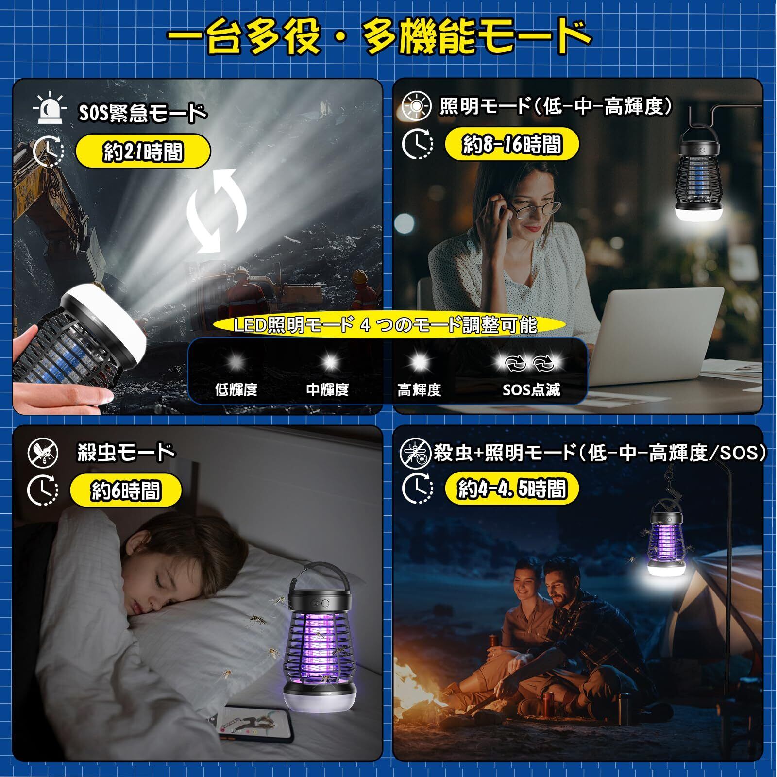 【USB充電式・一台多役・多機能モード】USB充電式で外での使用も楽々、持ち運び便利。コンセントがなくて も、捕虫器 はモバイルバッテリーで充電対応可能で。コードレスでも長時間使用できる虫除けライトなので、室内だけではなく、キャンプや夜釣りなどアウトドア用にもピッタリ。この製品は強力な電撃殺虫器であるだけでなく、LEDライト機能も備えており、実際のシーンに応じて調節が可能です。LEDライトのスイッチには4つの照明モードがあります(低輝度、中輝度、高輝度、SOS緊急モード)。3段階の明るさ低、中、高輝度を調節でき、新たにSOS緊急ライト機能を追加しました、緊急時にはSOS点滅ライトを使用して注意を引くことができます。蚊を駆除するだけでなく、装飾用の照明ライトやキャンプライトとしてもご使用いただけます、雰囲気作りや間接照明に最適です。キャンプ、釣り、寝室、オフィスなどでの使用をお勧めします。これらは同時に使用でき、以下の複数のモードを調節可能です:①殺虫モード ②殺虫+照明モード(低-中-高輝度/SOS緊急モード) ③照明モード(低-中-高輝度/SOS緊急モード)