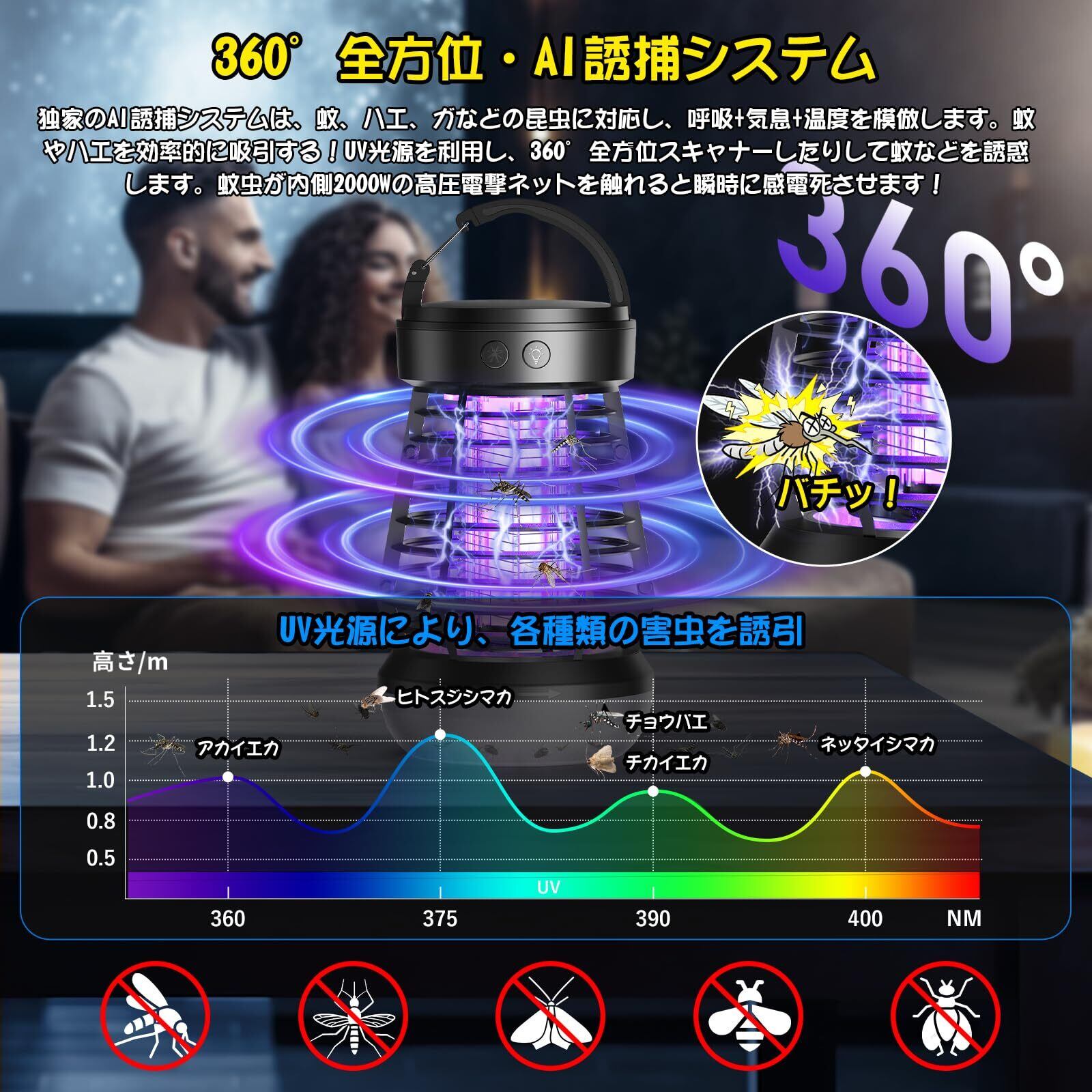 【物理蚊除け・薬剤不使用・安全設計】AI誘捕システム、360°全方位UV光源吸引式なので、物理的に蚊を殺します、薬剤を一切使わず。虫が好む光に集まる習性を利用して光で虫を引き寄せ、電撃ショックで一瞬蚊や蛾などの虫を殺す紫ライト誘引式の殺虫ライトです。物理的な殺虫方法を採用した電撃殺虫器で、無害無臭、煙や匂い、有害な化学物質などまったくないので、蚊取り線香や虫よけスプレーより安全で。電撃殺虫器は高品質で環境保護ABS素材を採用し、高密度のシェルギャップは7mmであるため、指が高電圧ネットに誤って触れるのを効果的に防ぐことができます。小さなお子様や、犬・猫などのペットがいるご家庭でも安心してお使いいただけます。快適に夏を過ごすことができます!(※蚊をよりよく駆除するためには、寝室で使用するには2時間前に電源を入れたほうがいい。)