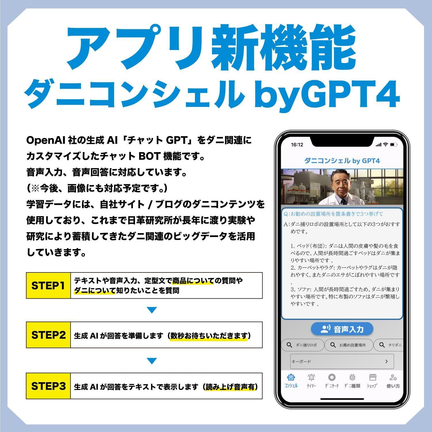 【アプリ新機能搭載! 】ダニ研究のビッグデータ×ChatGPTを活用したチャットBOT機能を搭載しています! 商品やダニ対策について質問に対して24時間いつでも即回答できるため、安心して使える商品です!