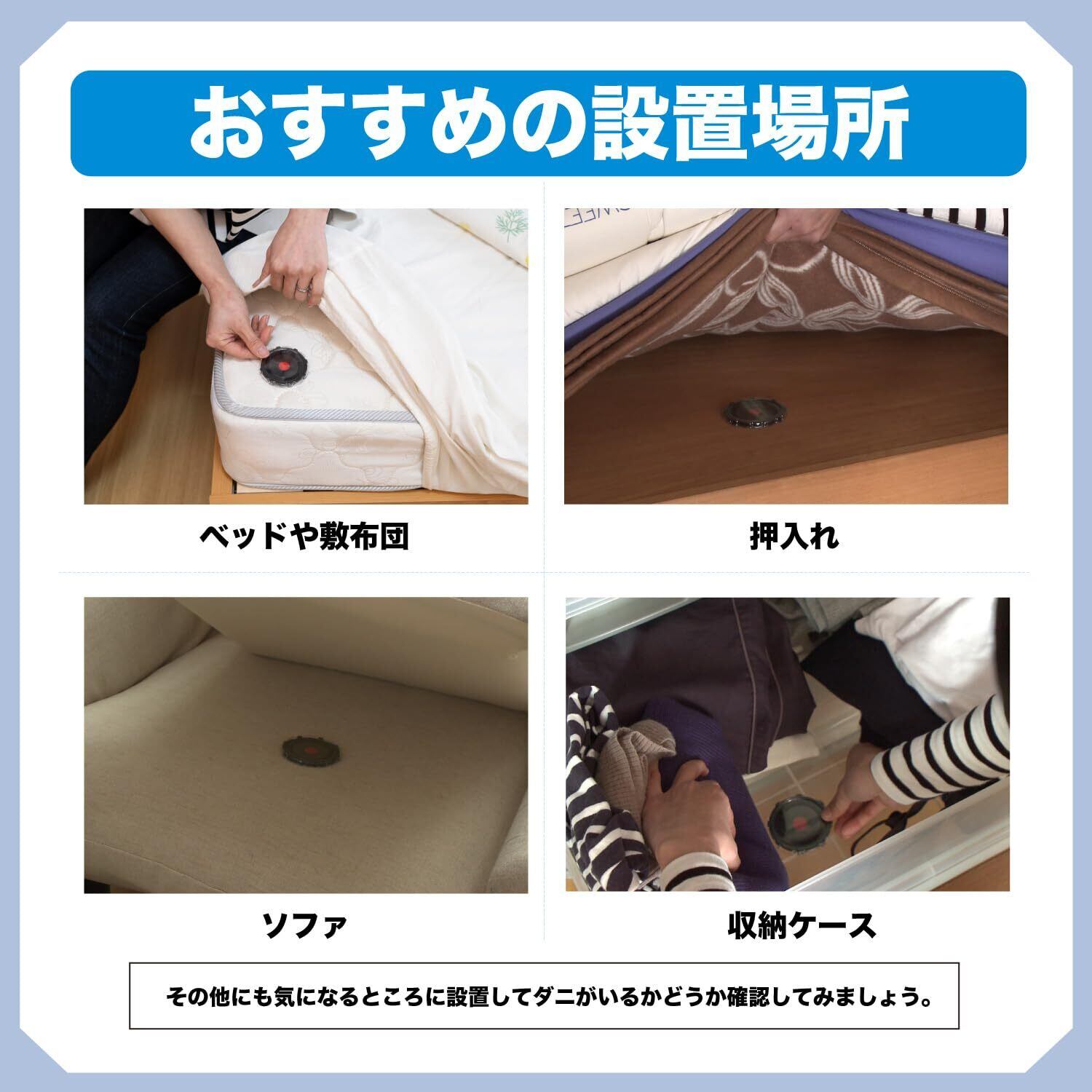 おすすめの設置場所:ベッド・布団・押し入れ・ソファ・収納ケースなど、ダニが気になる場所に設置するだけ! 設置後3日から1週間程度で、ダニの有無を簡単にチェックすることが可能です!