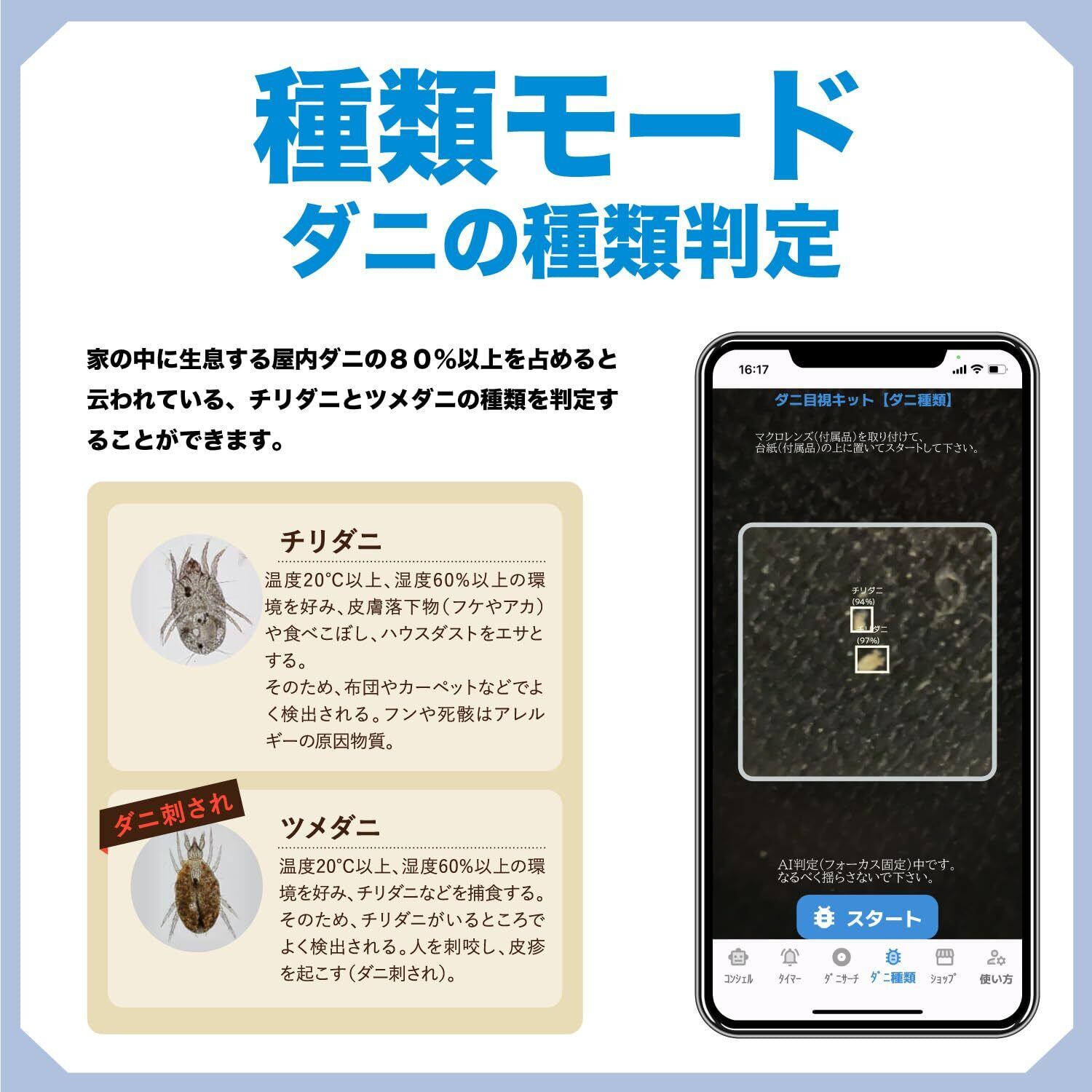 殺虫成分不使用の誘引剤が目に見えないダニを誘き寄せ、付属の15倍ルーペで確認可能! さらに、専用のスマホアプリと連携すれば、 ダニの数、ダニの種類、汚染レベルまで「見える化」し、お部屋のダニリスクを数値で把握することが可能!