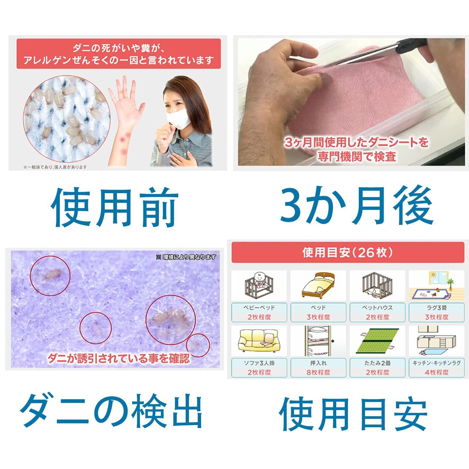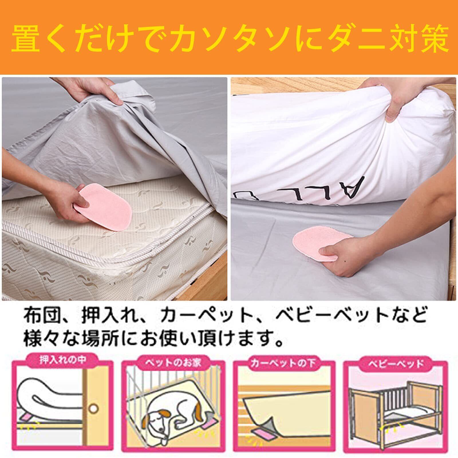 【適用場所】ダニが繁殖する場所(カーペット、マットレス、ソファクッション、収納ボックス、収納キルト、ワードローブ、マット、ペット用ベッド、クローゼット、その他のダニが集まる場所など)に配置します。※シングルベッドの場合、上下に1m程間隔をあけてマットレスと敷きバットの間に挟み込んでセット。