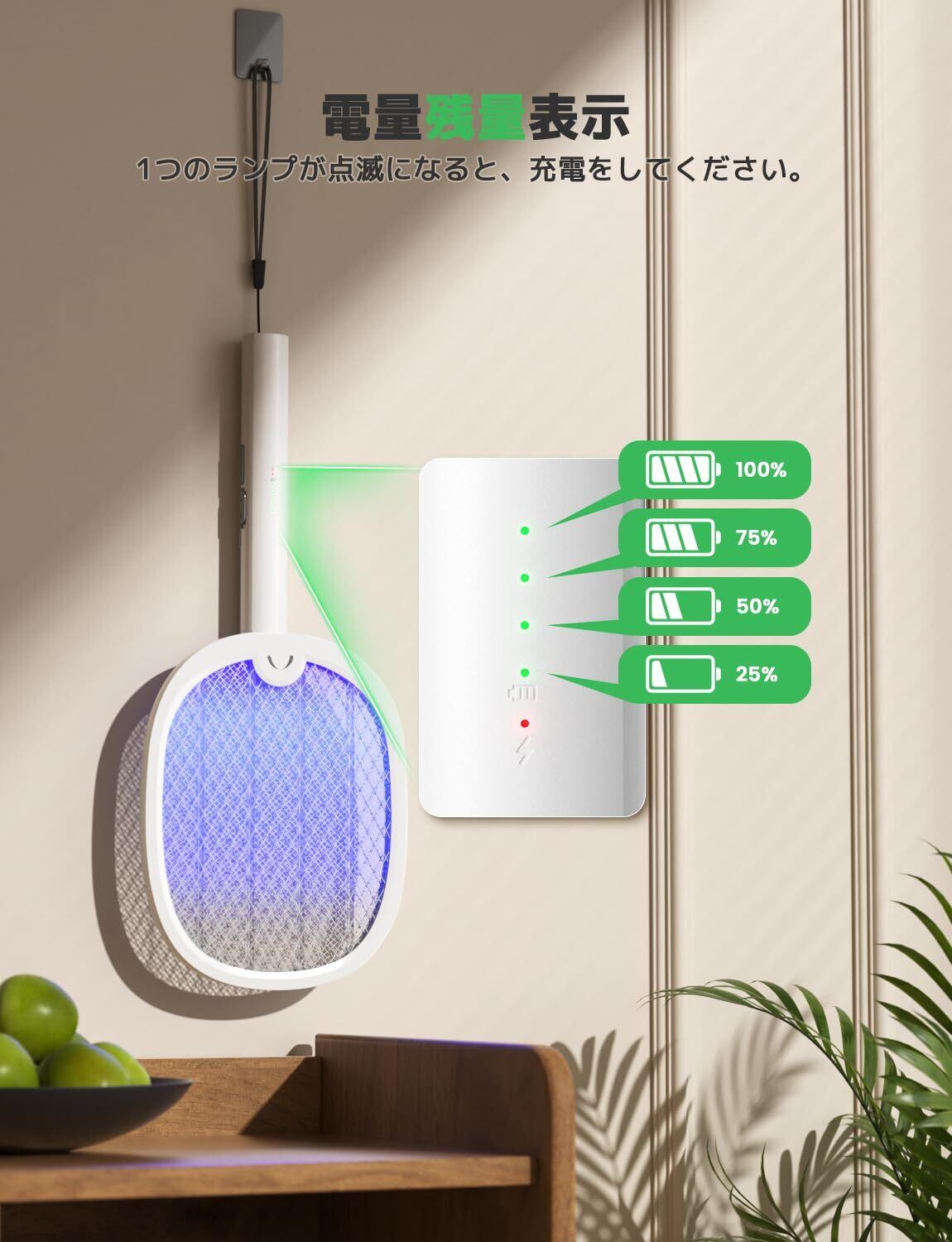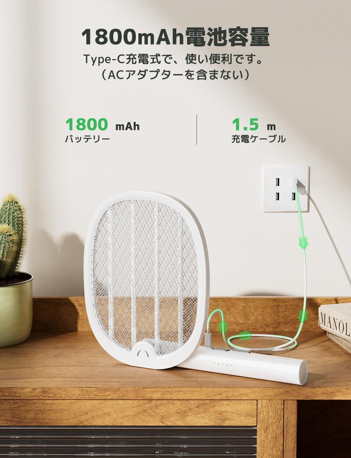 充電式タイプ:USB Type-C充電式で、電池を購入し続ける必要はありませんです。常時通電モードでは、充電しながら使用できます。睡眠ときの虫除けとして使用できます。電量残量表示されますので、ラケットの電量がよくわかりやすいです。
