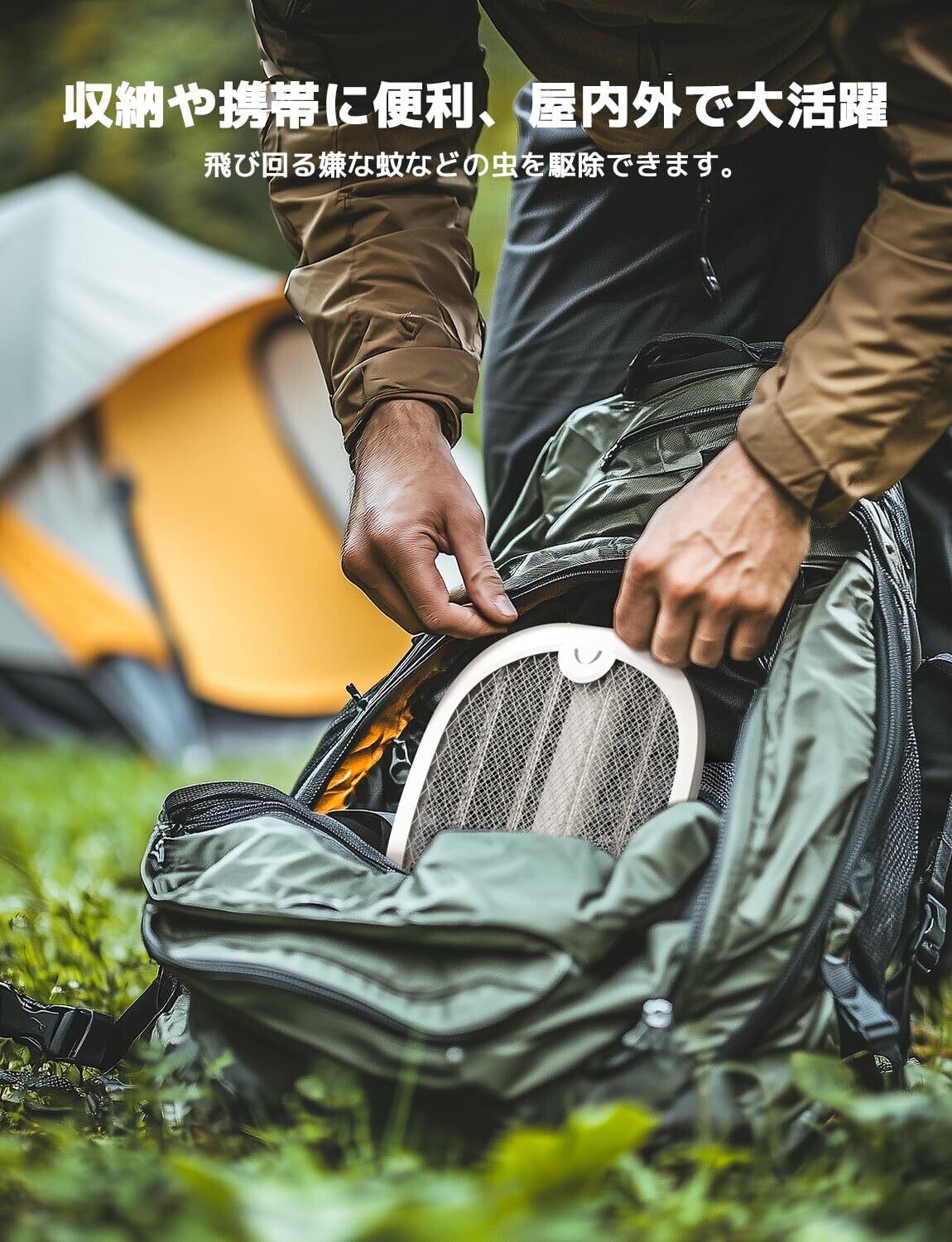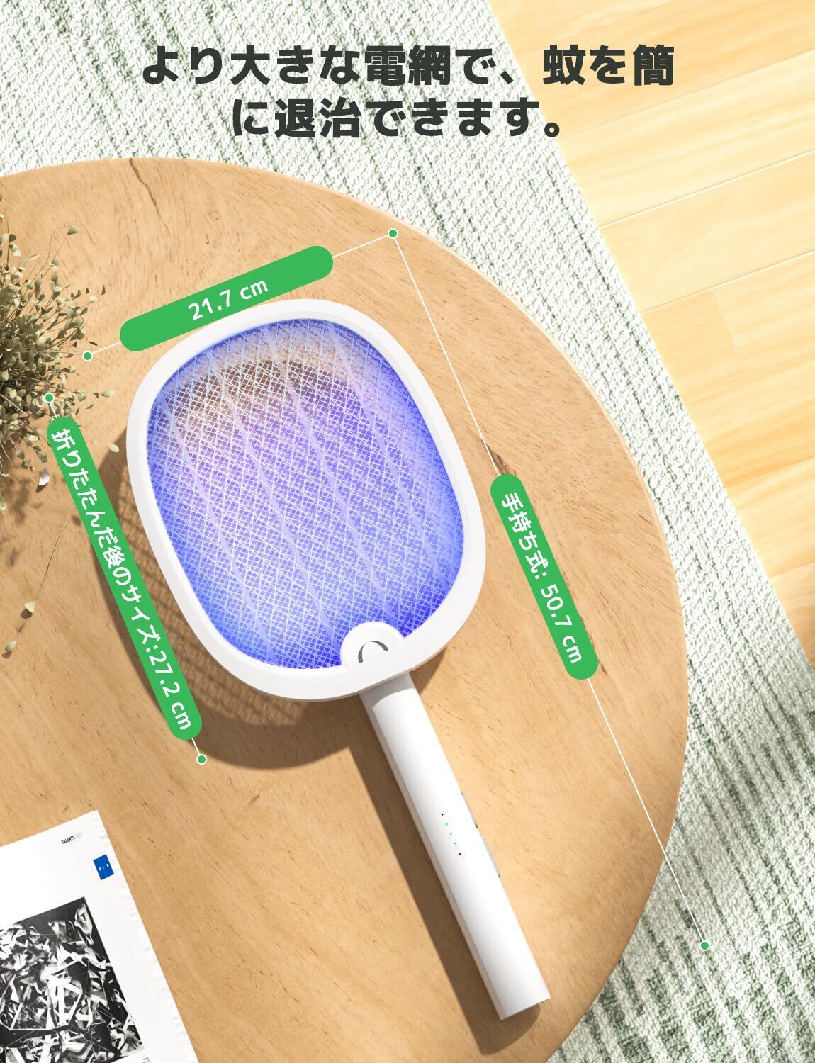 180°回転:折り畳み可能なデザインで、持ち運びもラクラク。手持ちと置き型の2wayで使えます。オートモードで電撃殺虫ラケット中央に搭載された紫外線ライトの誘蛾灯が点灯し、365nmUVで虫を360°引き寄せて吸い取ります。軽くて持ち運びに便利で、アウトドアにぴったりです。
