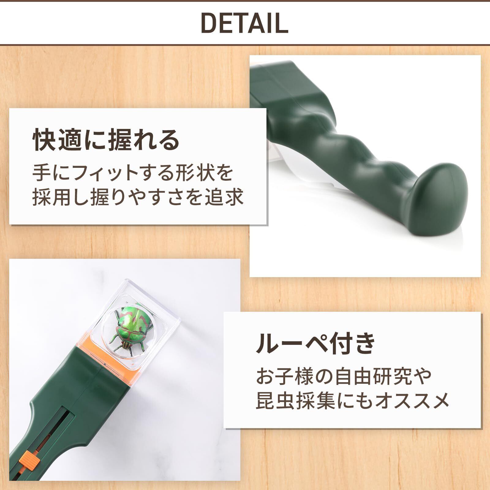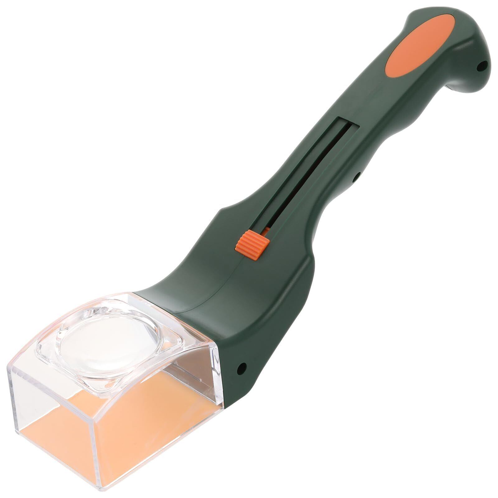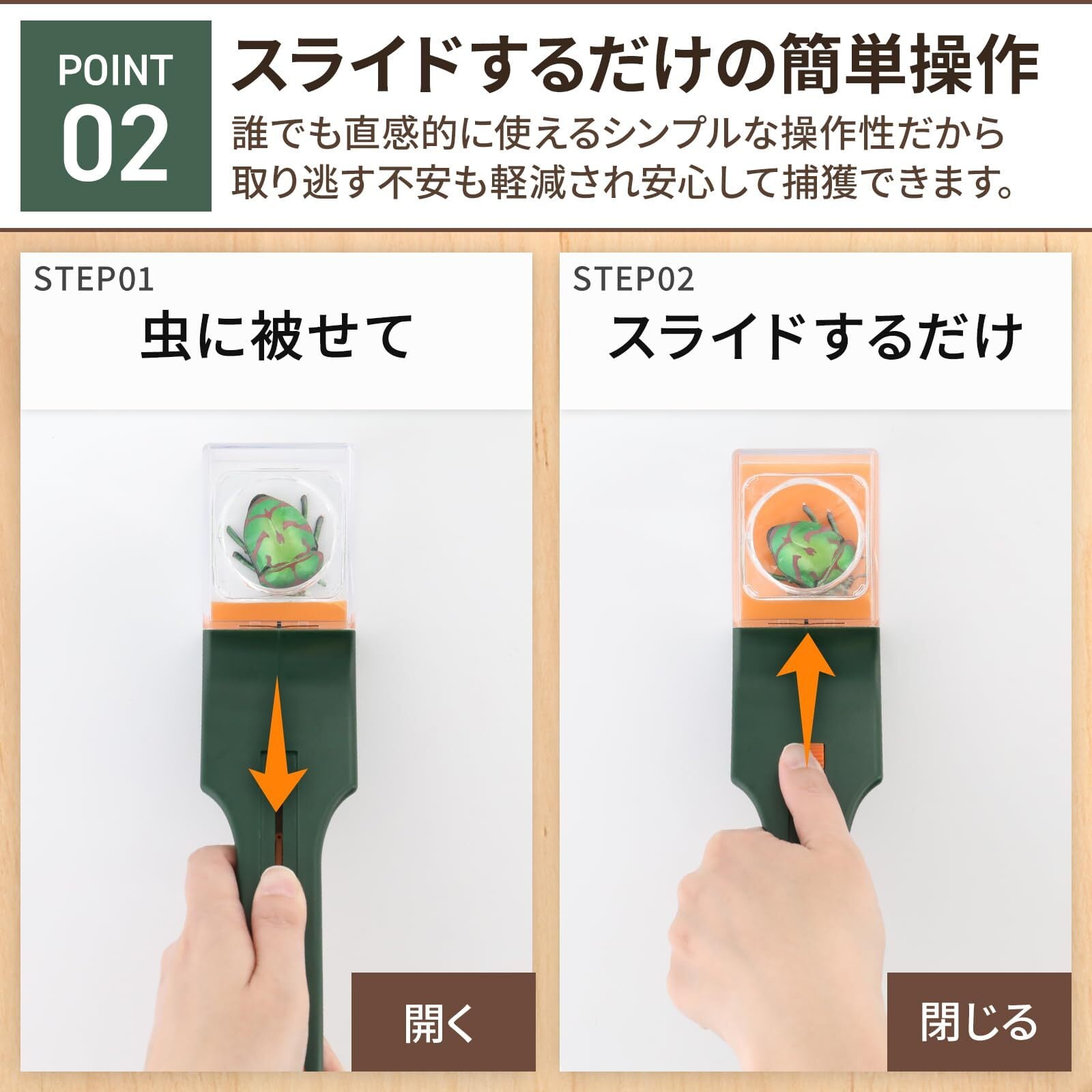 使い方は簡単です。本体のボタンをスライドして蓋を開閉して虫をキャッチするだけです。先端の捕獲部分はクリアでレンズ付きなのでカメムシをキャッチできたか確認が可能。捕獲内部は隙間がないので捕獲後に逃げる心配はありません
