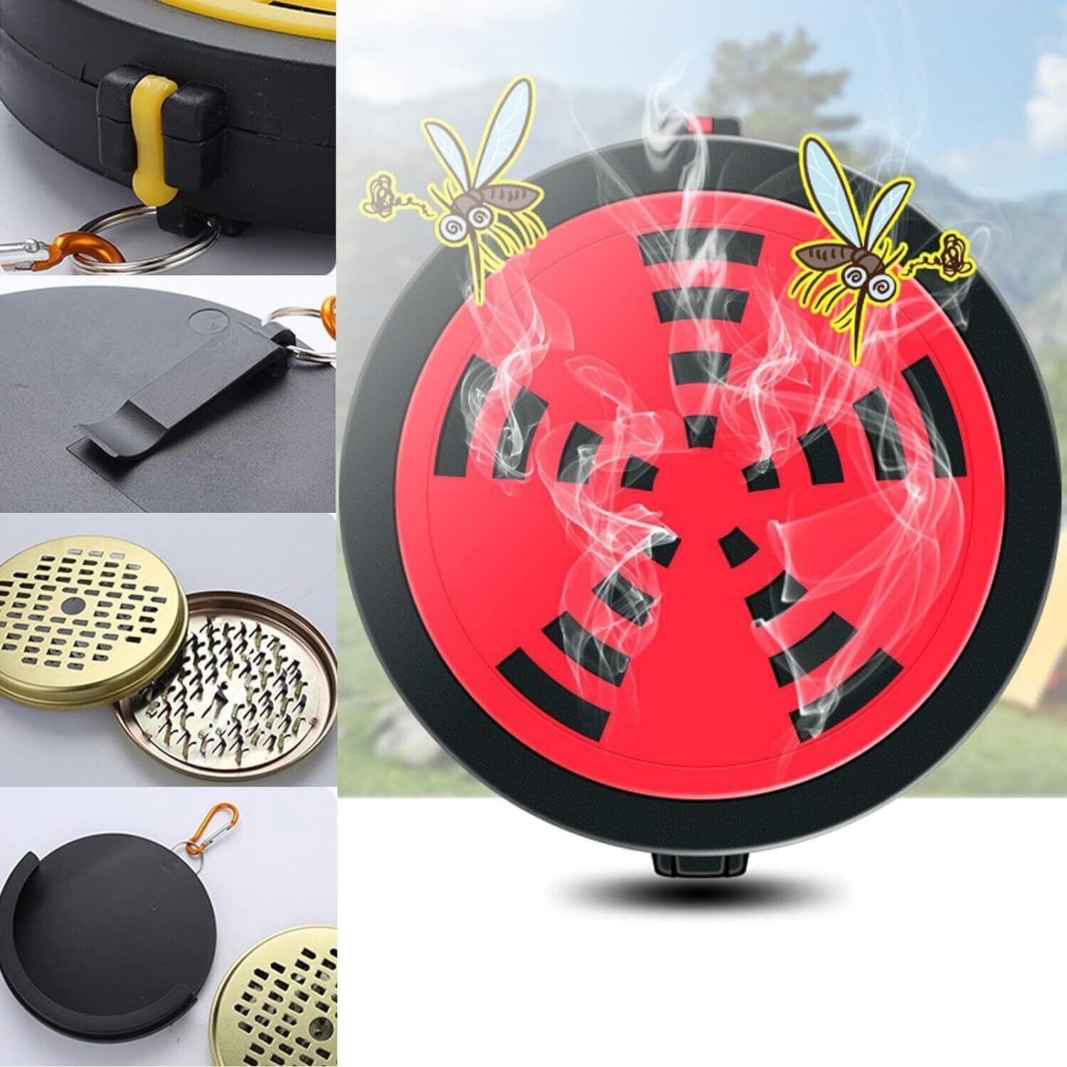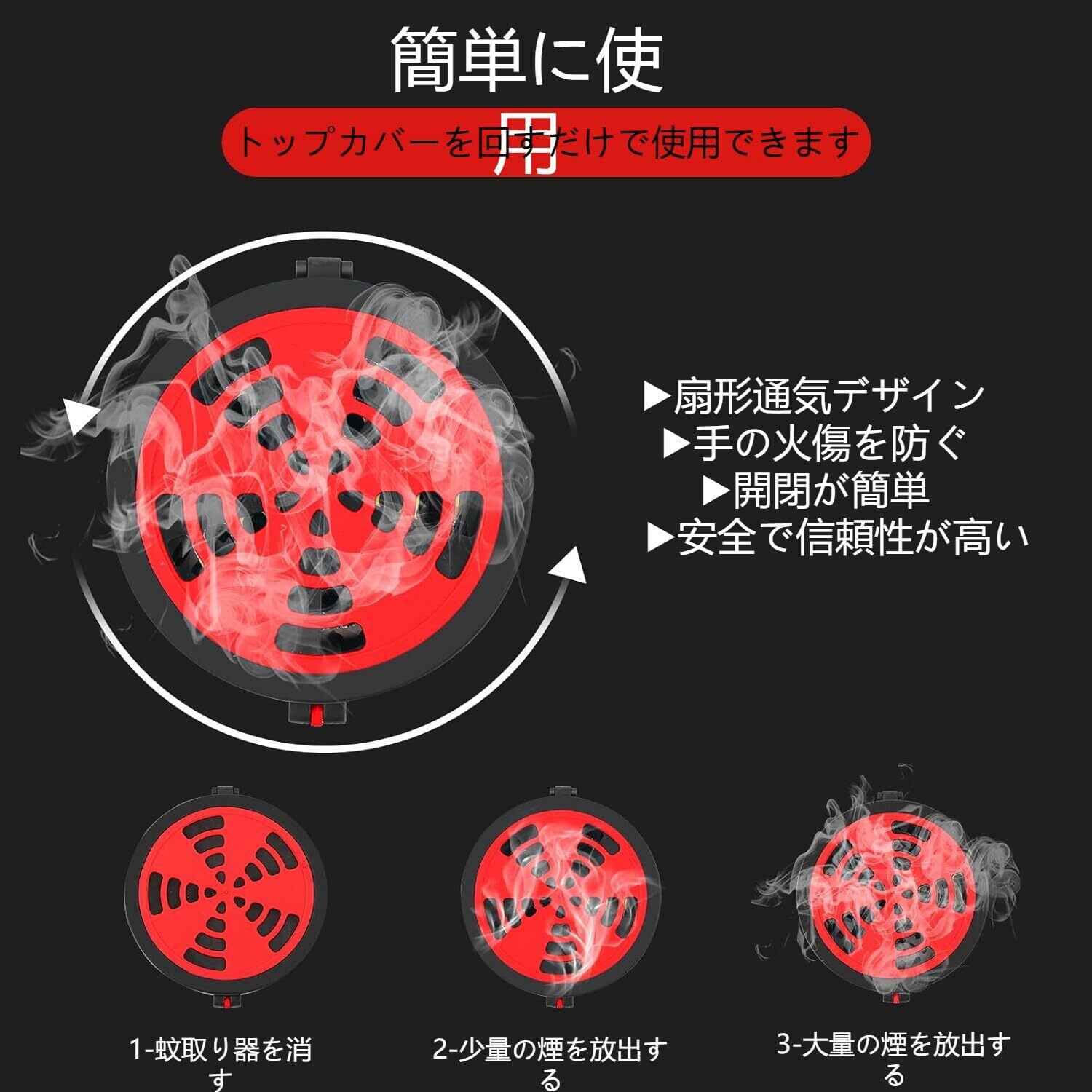 扇形通気デザイン"蓋付き、蓋の中央は回転でき、使う時は穴を開けてください。使用時に煙の出口のサイズを自由に調整できます。非常に便利です。閉めると、効果的に空気の侵入を遮断するので、蚊取り線香が自動的に消えます。