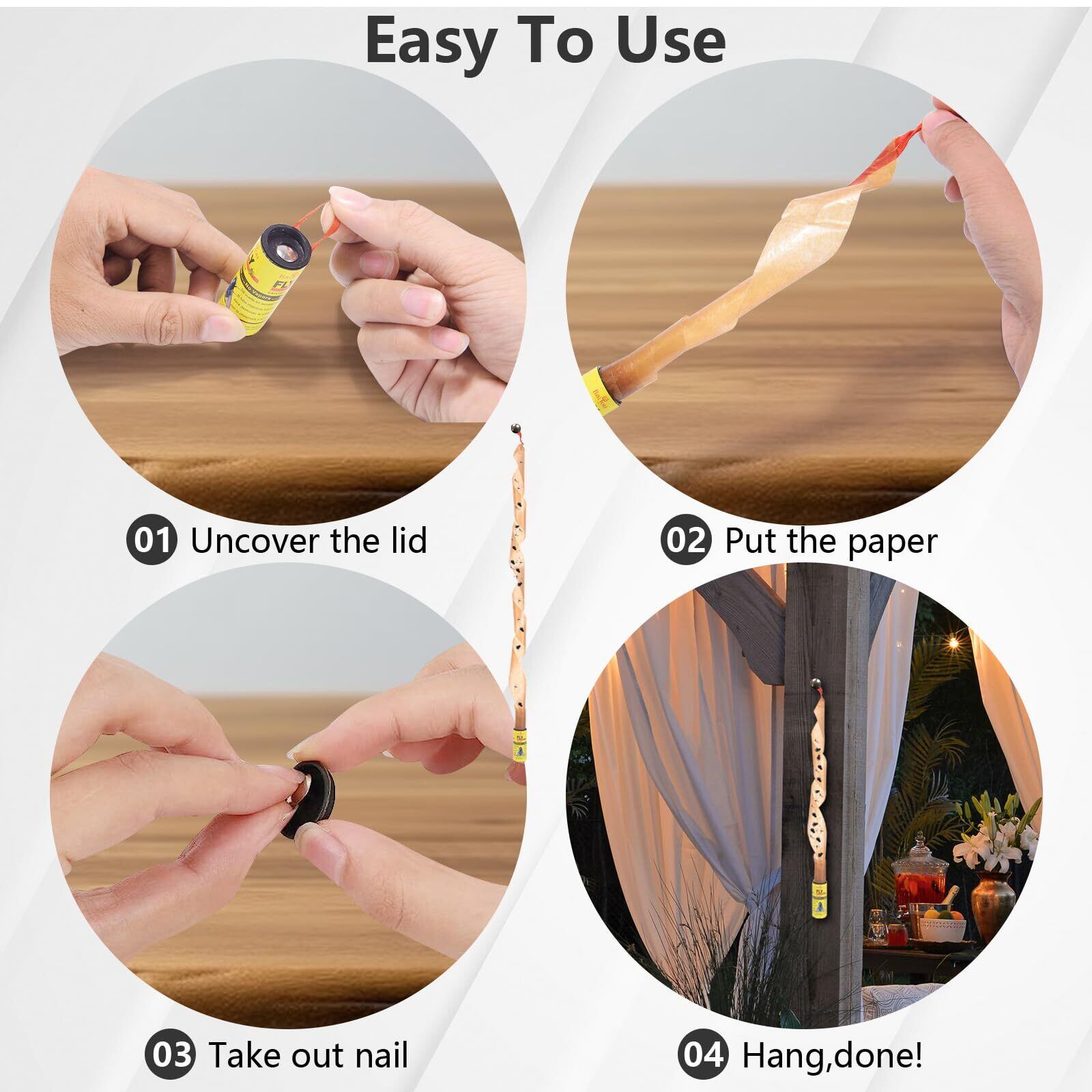 使いやすい:損傷を防ぐ注意と親切に蠅捕り器を扱って下さい。はえテープの接着剤は強いです、それがあなたの皮でスタックしないことを確かめて下さい。それがすれば、水なしで植物油、アルコールまたは手の消毒剤を使用して粘着性を除去できます。