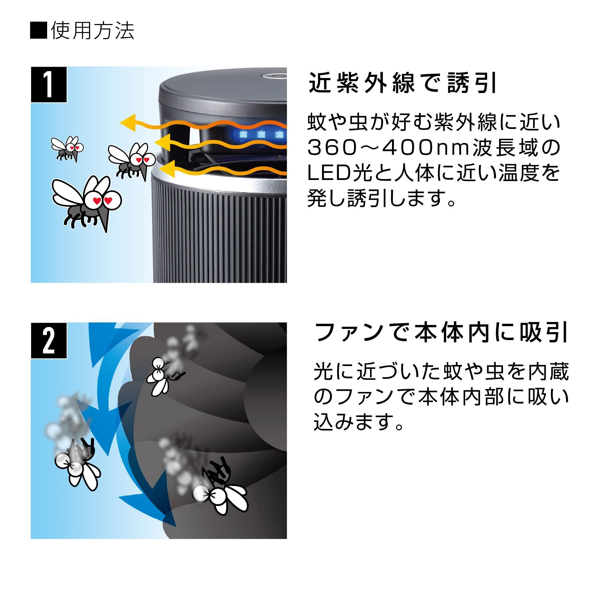 ●(UV光源で蚊や虫を誘引、ファンで乾燥させて駆除)