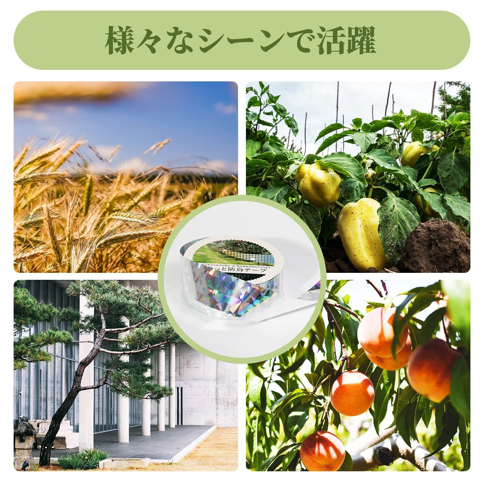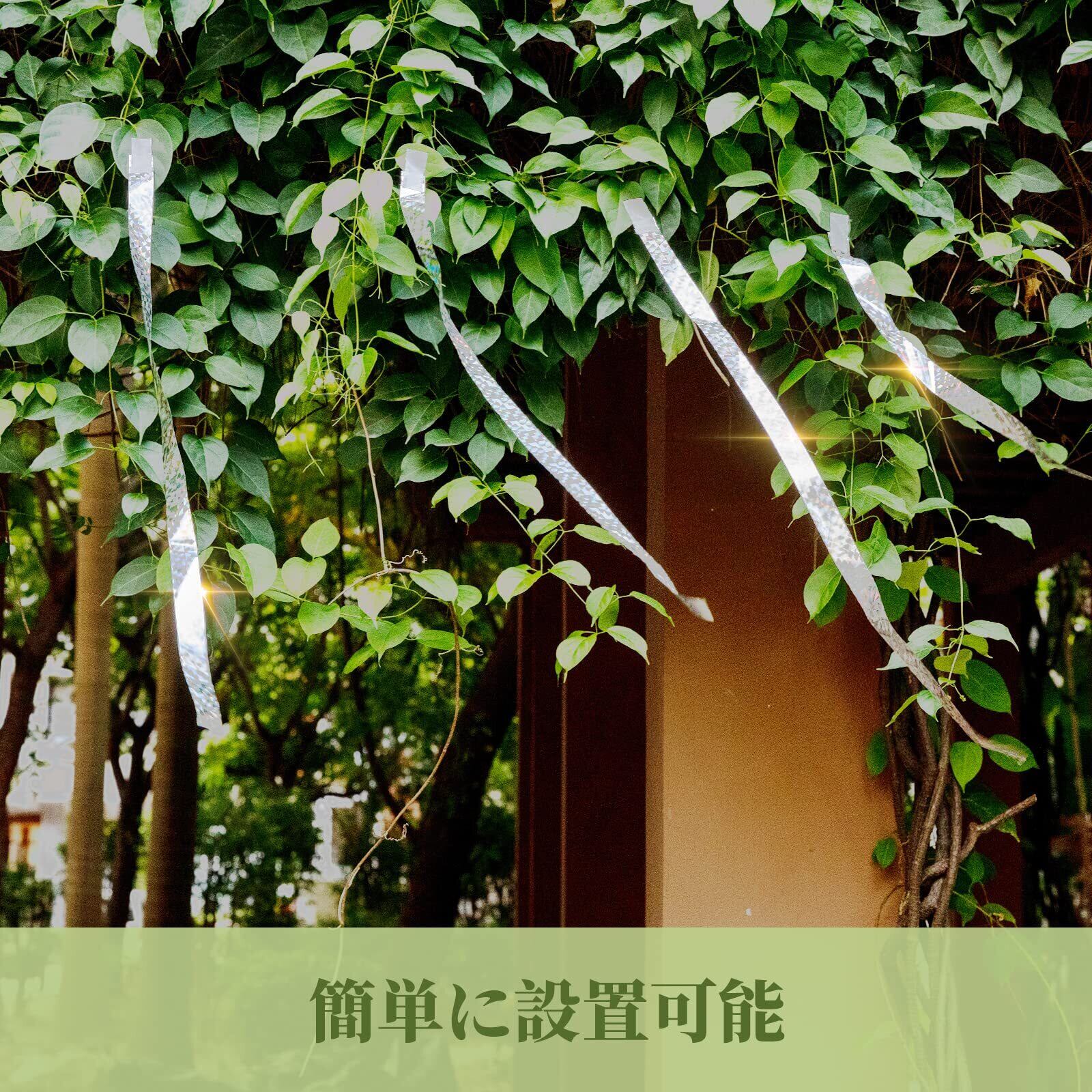 [設置簡単 どこでもタイプ] 丈夫な素材でつくられているので、どこでも取り回ししやすく、風のない日であれば、一人でサクサク設置できます。ハサミで適当な長さに切り、キラキラと風になびくように結んだぶら下げたものを一定間隔で取り付けます。そうすることでなびきやすいし、テープが揺れた時にカサカサ音もするので効果が大きいですが、鳥が寄り付かなくなります。それともこのテープ輪を作ってセロテープで止め、風で揺れるようにゆるい輪を設置場所のあちこちに沢山巻いたところ、鳥よけ効果が驚くべきです。また、テープで軽いので、万が一台風などで飛んでいって、事故が起こる可能性もゼロです。気にせず色々なところに取り付けできます。