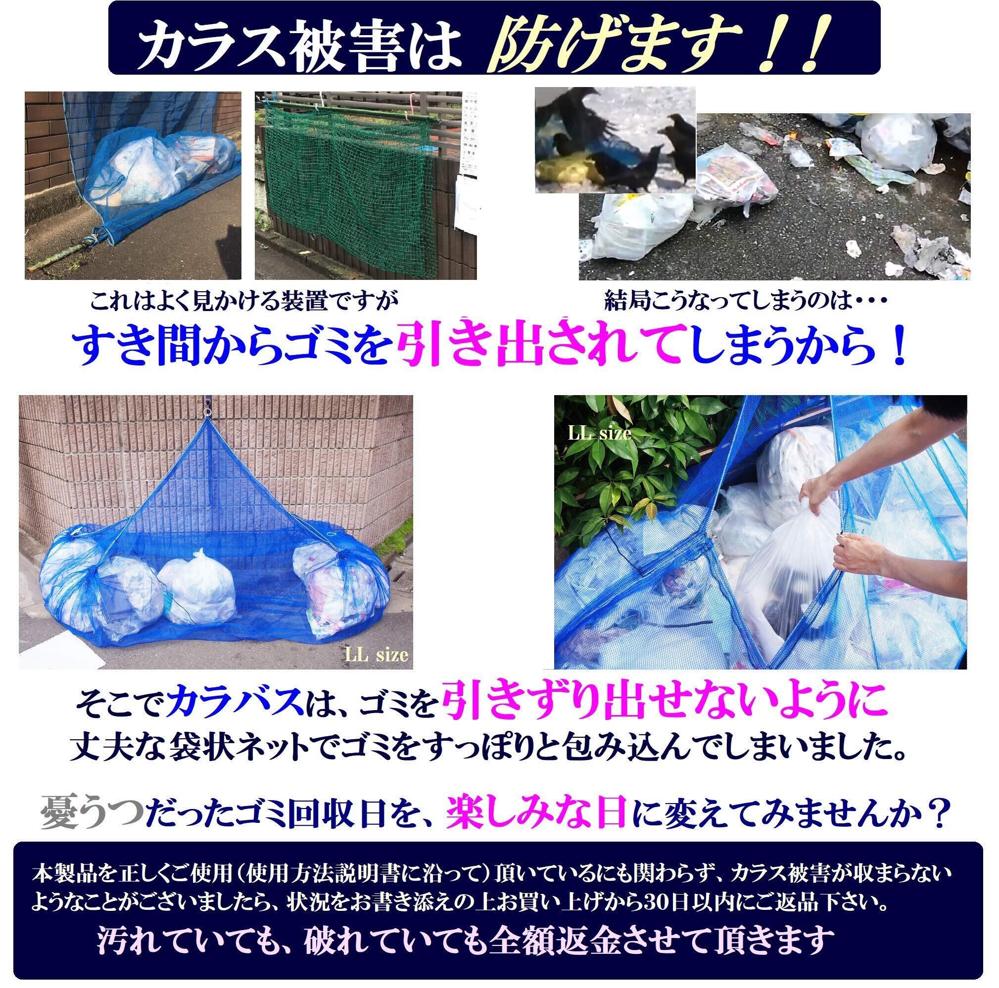 【これ一つでカラス対策は完結!!】 これまでとは “全く逆の発想”でカラスの被害から解放してくれる[カラバス]の“オリジナル袋状ネット” 全5サイズを好評販売中!! ゴミ袋を上から覆うのではなく、下からスッポリと包み込み、一箇所で吊り下げることでゴミをしっかりガード!! カラスによるゴミの引きずり出しと散乱を防ぐカラスよけネットです(もしカラス被害が収まらない場合は状況をお書き添えの上30日以内にご下さい、全額返金させて頂きます)。今まで憂うつだったゴミ回収日を楽しみな日に変えてみませんか?