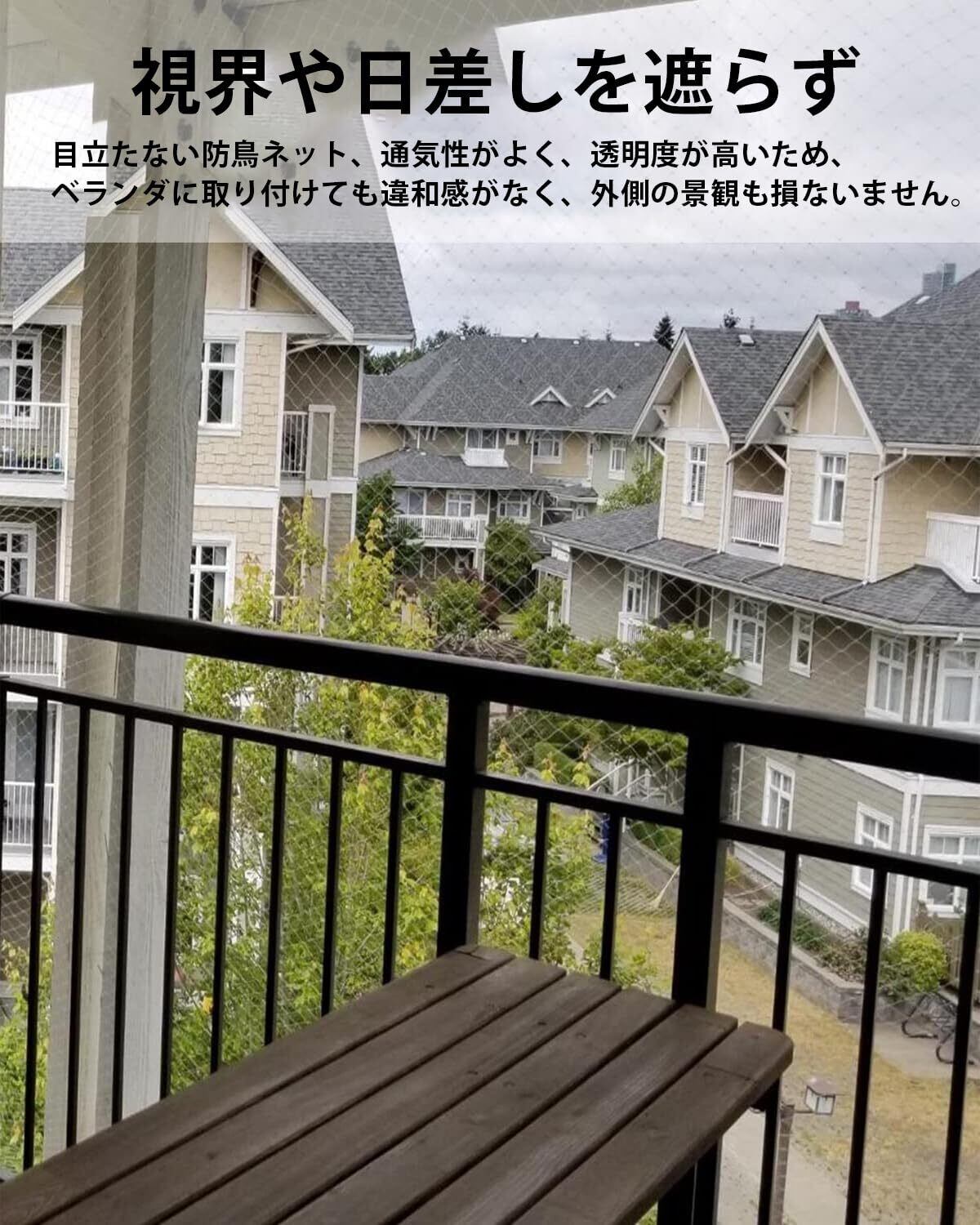 【外観の雰囲気を損なわない】透明テグスのぼうちょうネットは外から見ても目立たず外観の雰囲気を損ないません。視界もよいので圧迫感を感じさせないです。ちょうどいい網目のサイズで、鳥よけと通気性を両立できます。風をよく通るので夏も涼しいです。ご自宅のベランダ、お庭、ゴミ置き場、お店、オフィスビルの屋上など様々なシーンでご利用いただけます。