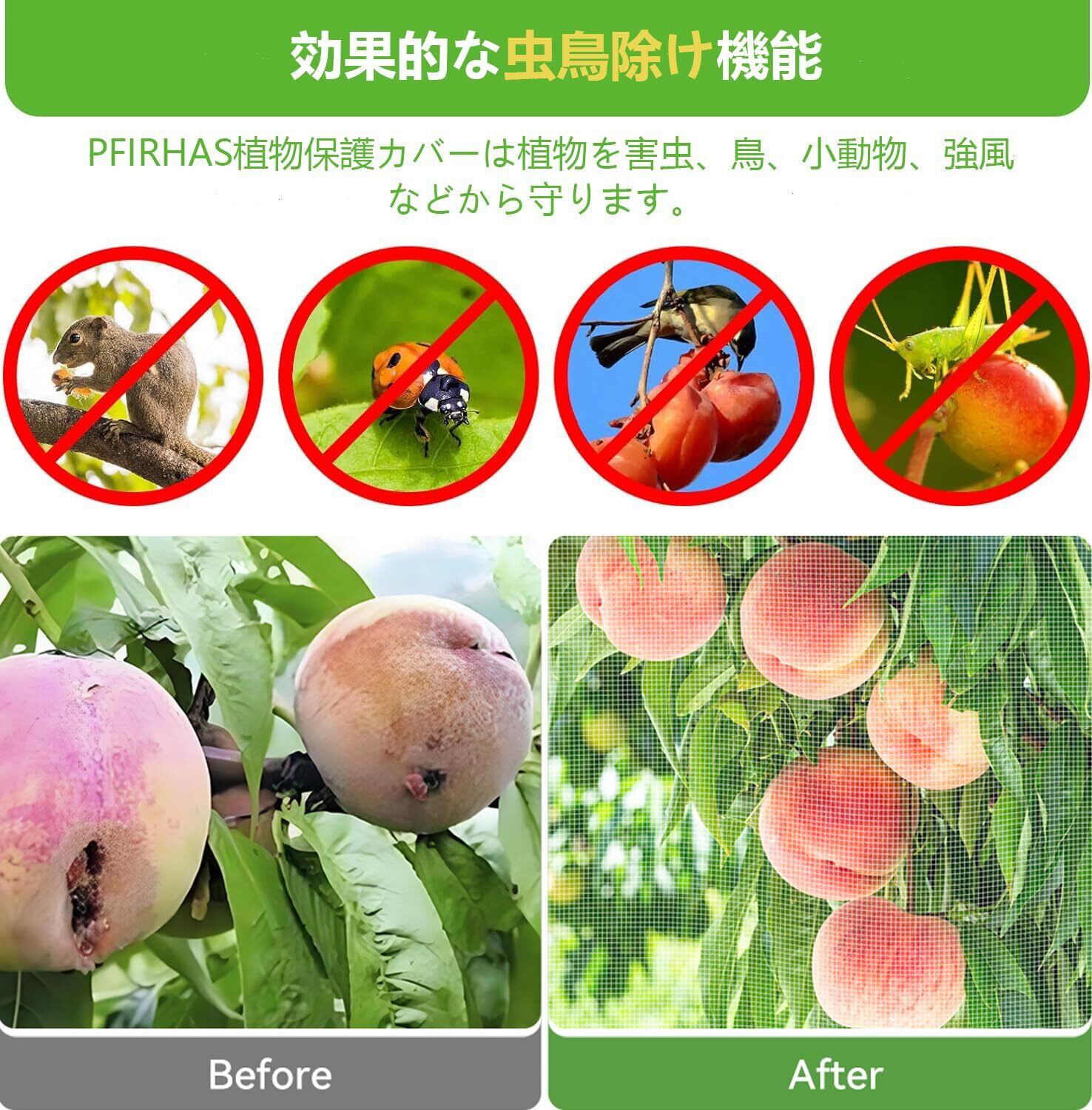 【耐久性と通気性】PFIRHAS虫鳥除け網は高品質のポリエチレンPE素材を採用しており、異臭や毒性がないだけでなく、耐低温性、耐熱性にも優れ、強度が高くて耐久性も良い。また、約1mmの極細メッシュ構造により、植物を害虫から保護する同時に、鳥よけ、防塵、防氷雪も可能で、日光強度をある程度弱める効果があります。必要的な日光、空気、水分を通過させ、植物の発育と成長にあまり影響を与えません。軽量設計なので植物に負担をかけません。更に、極細の植物保護ネットは、収穫した穀物の大きさを問わず穀物保存袋として使用できます。