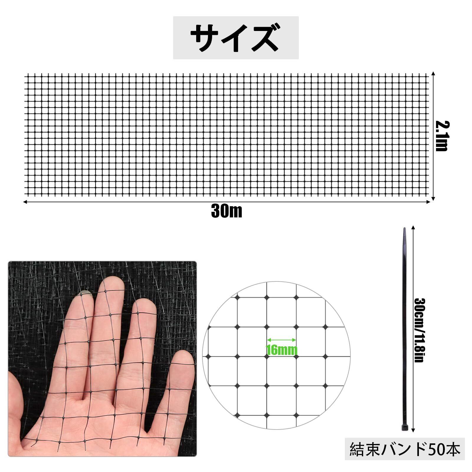 【製品仕様】材質:ナイロン カラー:黒 幅:2.1m 全長:30m 目合い:16mm パッケージ内容:ネット(2.2*30m)*1巻、ケーブルタイ*50個。