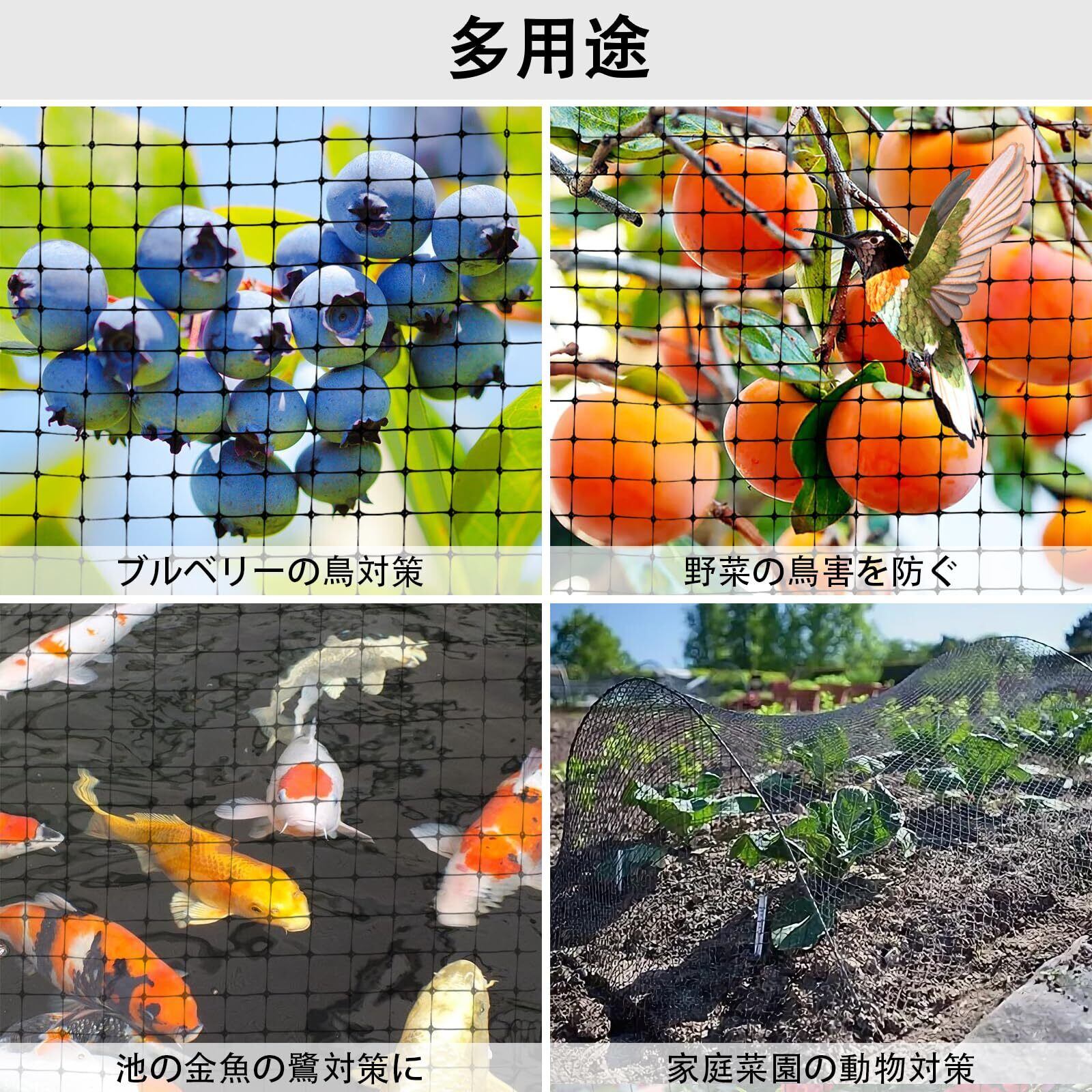 【鳥からの被害を防ぐ】家庭菜園や畑向け防鳥ネットです。ハトやツバメ、カラスなどに悩んでいる方にオススメ!ブラック色で、目立たず景観を損ねないのはポイント。16mm極細網目で鳥によるゴミ被害や菜園被害を効果的に防げます。果樹、菜園、ゴミの被害への対策として、様々な場所で活躍しています。