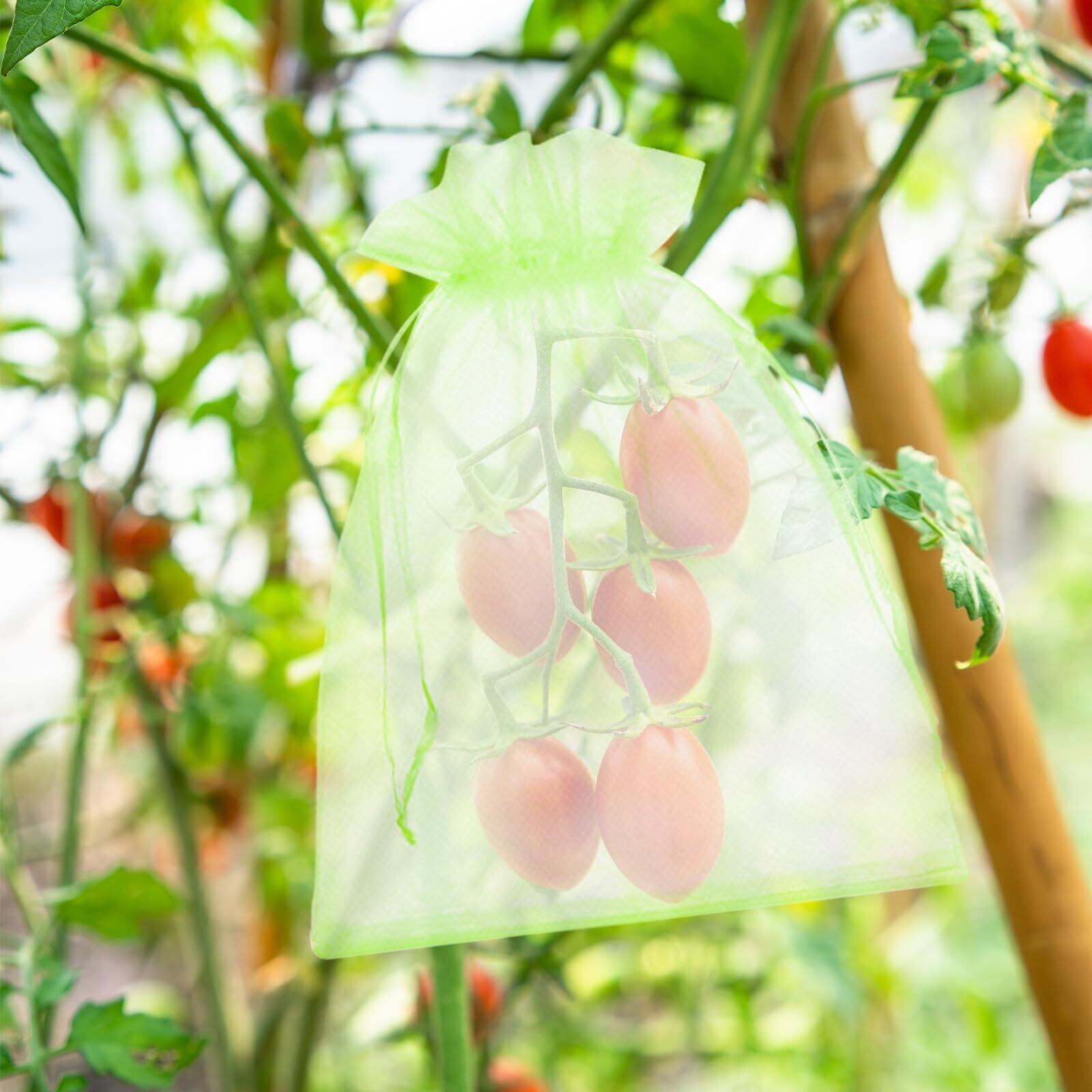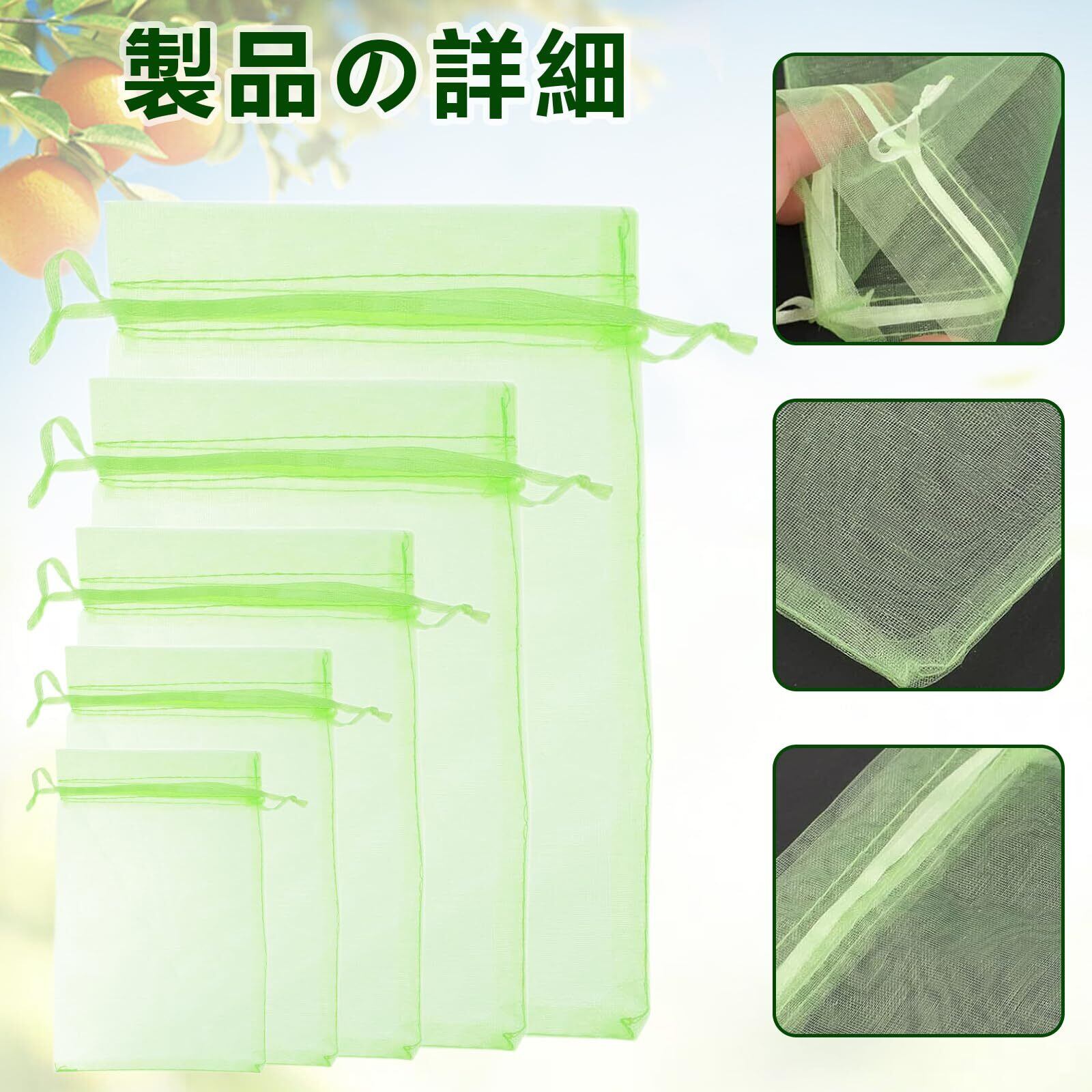 【通気性、耐久性のメッシュ素材】丈夫なオーガンジー素材で作られた果物袋は、耐腐食性と耐久性に優れ、軽量で通気性が良く、頑丈なのが特徴です。この透過型デザインは、光合成を妨げないため、野菜や果物の日光の吸収がよくなり、健康に育つことができます。