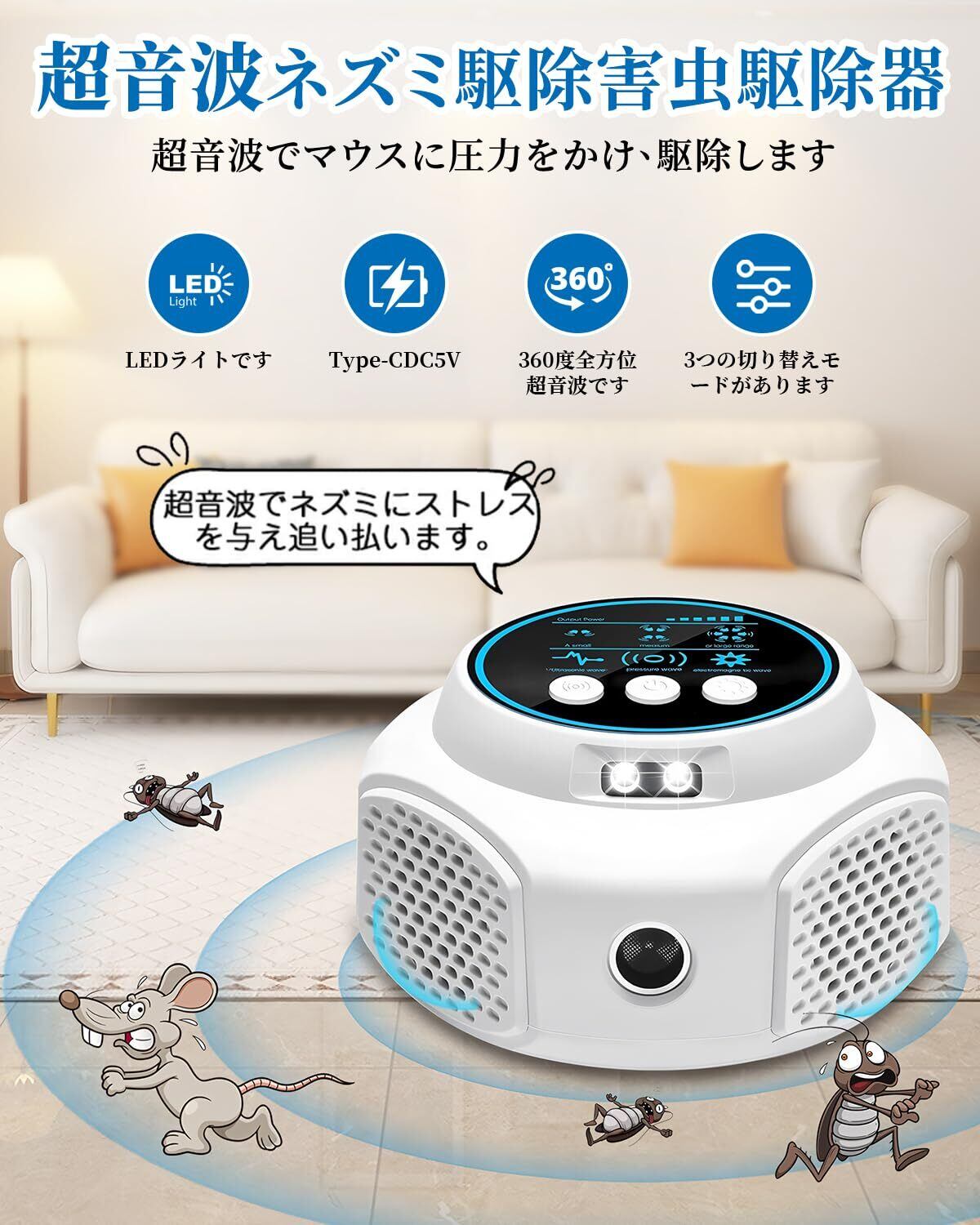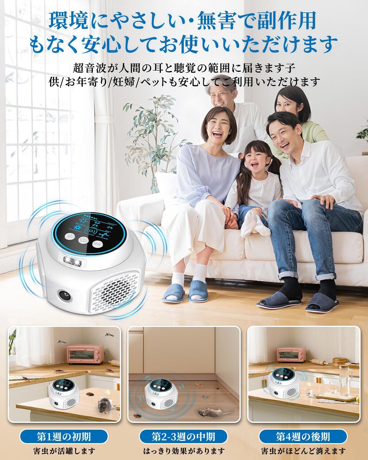 【安全性と信頼性】お子様や妊婦のご家庭では、化学品やスモッグ、スプレーなどの使用が心配になるかもしれません。害虫駆除装置は化学品を使用していません。有害物質を排出しません。子供や妊婦にも安全です。発せられる超音波は、害虫の生活環境を物理的に破壊し、害虫とネズミだけに影響を与えます。