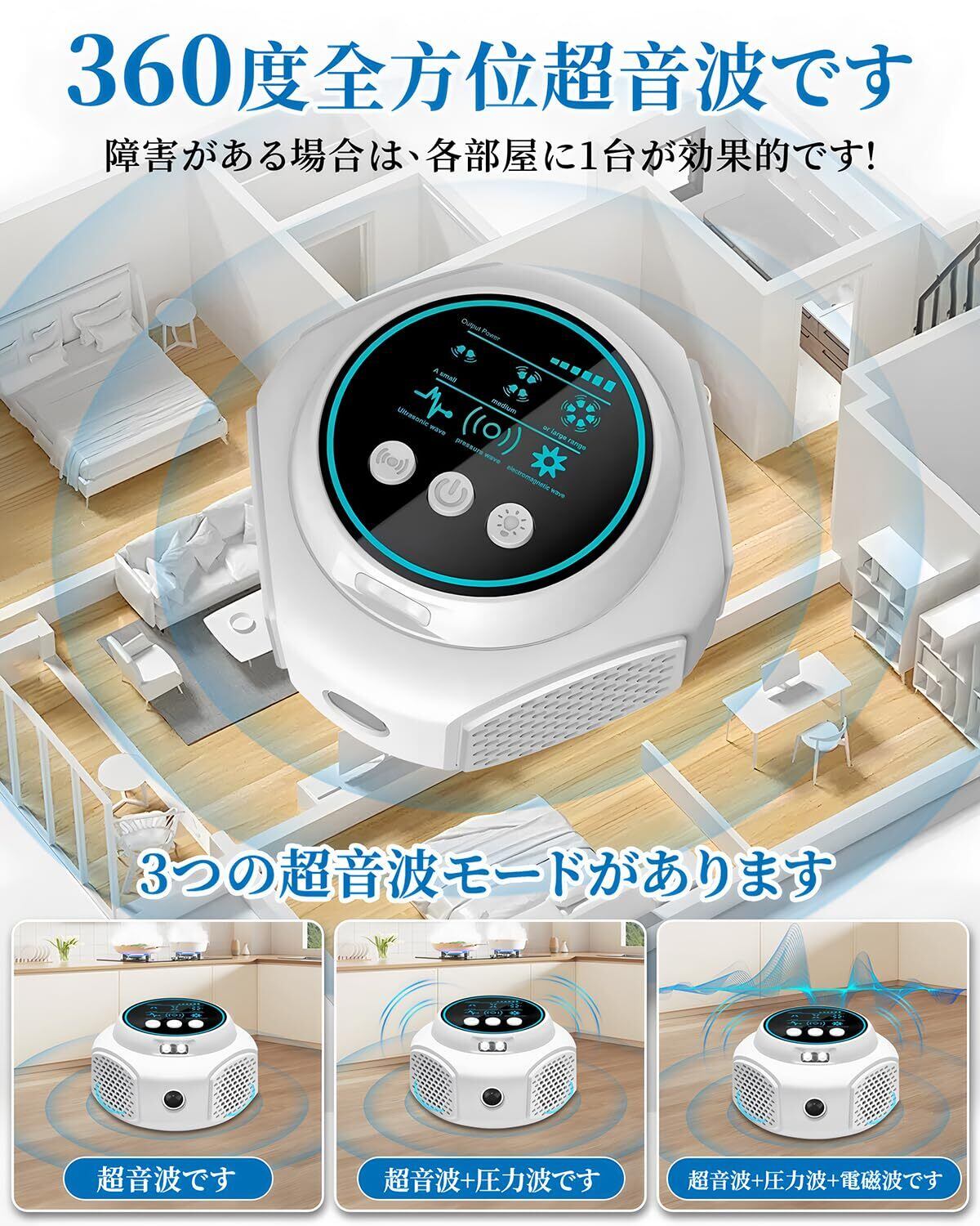 【360度虫よけ+4種類のスピーカー電磁波】360°強力チップで、3つの超音波モードと360°放射を組み合わせてネズミなどの害虫を駆除します。4つのスピーカー装置が同時に働き、蚊に邪魔されず、快適なオフィス、学習、睡眠環境を提供します。