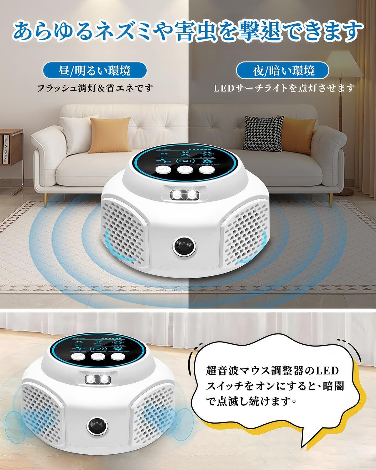 【超音波でネズミを撃退!】この超音波駆除機は、超音波を発し、LEDを点滅させることで、害虫やネズミの神経系や聴覚を刺激し、不快感を引き起こしてその場所から遠ざけます。これにより、食べ物や家具の被害を防ぐことができます。おびえて追い払うのです人体にもペットにも害がないので安心です。家庭やオフィスでのネズミ駆除に最適です。