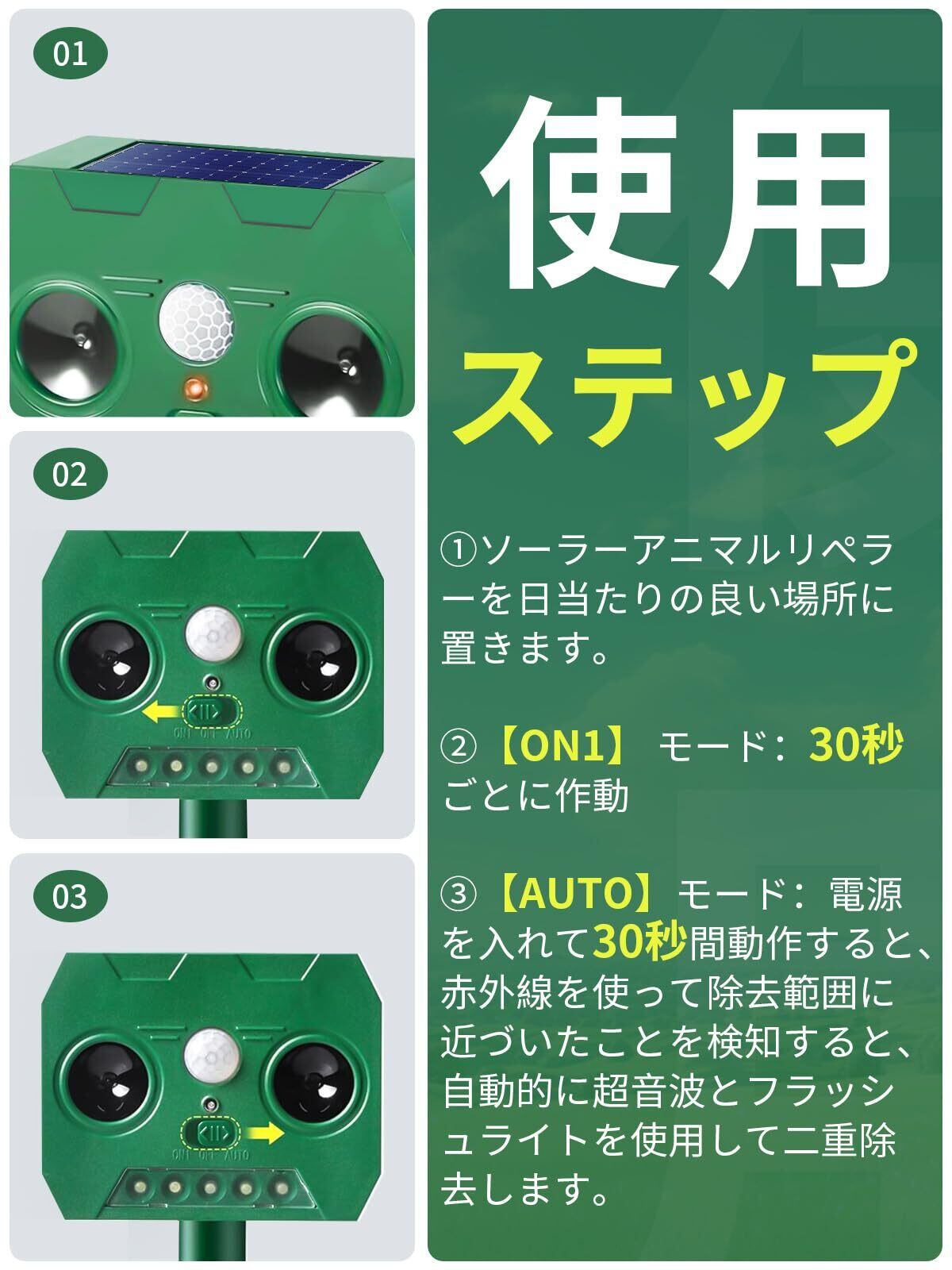 【環境に優しいソーラー電源、全天候型自動作業】高効率ソーラーパネルを採用し、外部電源不要、日中自動充電、省エネ、曇りの日でも連続給電。 夜間は自動的に点灯し、24時間中断されない作業モード、野生動物の侵入から、24時間あなたの家を守るために、本当に緑、環境保護、撃退するための省エネの方法。