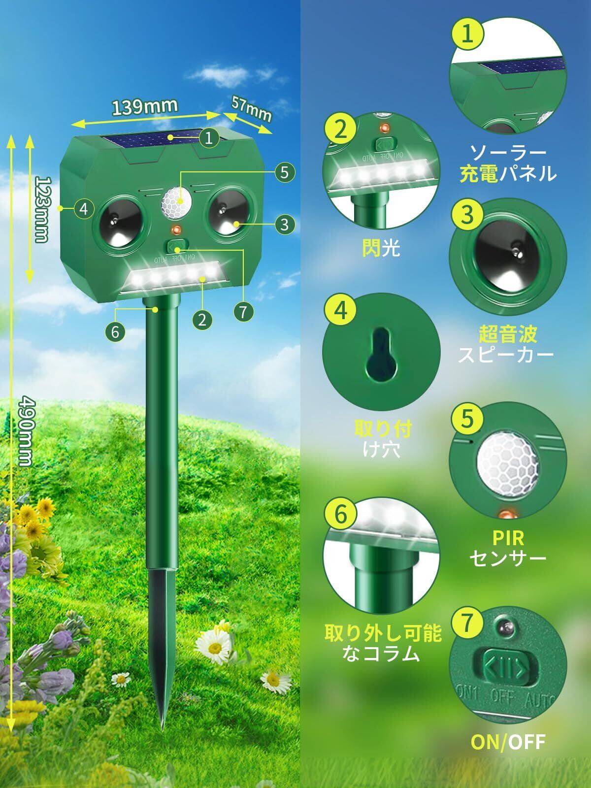 【幅広く適用、ソケット&壁掛け、取り付け簡単】テラス、ガーデン、キャンプなど様々なアウトドアシーンに適しています。 シンプルなデザインで、本体を付属の支柱に組み立て、取り付け場所に差し込むだけで、誰でも簡単に設置できます。 また、リペラー背面の吊り下げ穴から木や壁に固定することもできます。 コンパクトで持ち運びに便利な超音波式獣撃退器は、自宅でも旅行先でも、外出先でのガードになります。