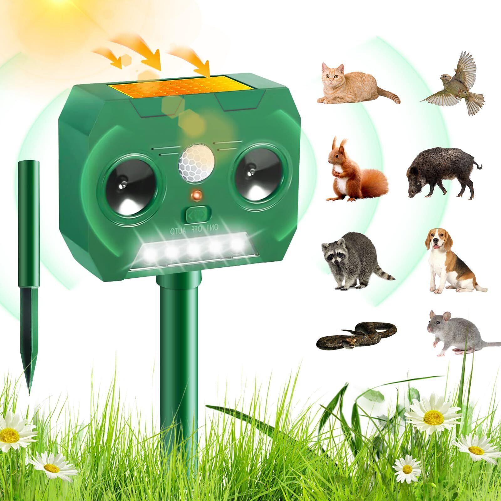 【インテリジェント周波数変換技術、動物の適応を避ける】インテリジェントチップを内蔵し、自動的にランダムに超音波周波数とフラッシュモードを変更し、動物が同じ周波数に長期間さらされることによる適応を防止し、長期的な忌避効果を確保し、忌避戦略は常に効果的であるように、あなたの庭、果樹園、菜園、および他の領域が清潔に保つために継続する。