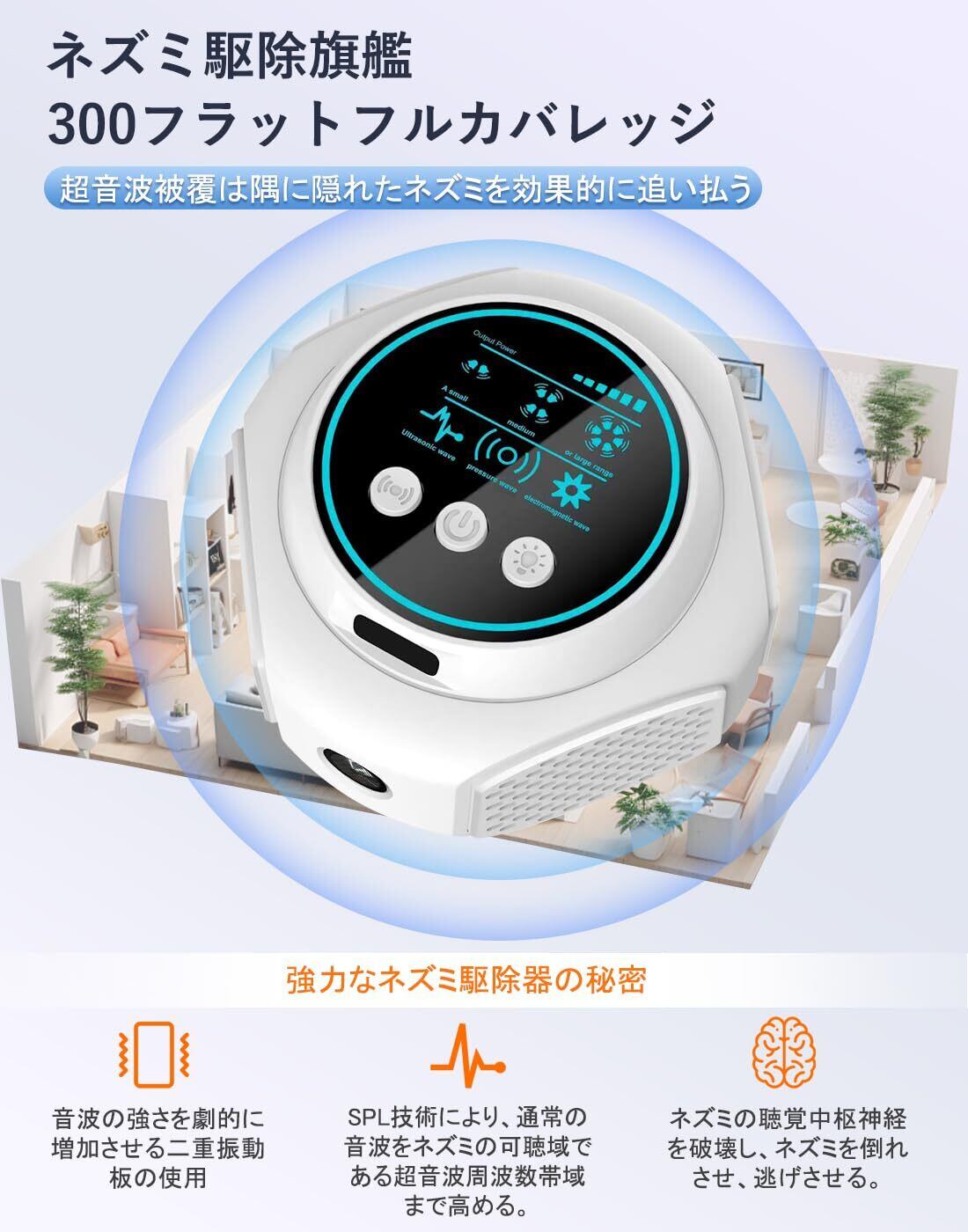 【先進の超音波技術で害獣を遠ざける 】 強力な駆除効果:この超音波ネズミ駆除器は、先進の超音波技術を採用し、様々な害獣(ネズミ、ゴキブリ、蜘蛛など)を効果的に追い払います。超音波は人間には聞こえず、ペットにも安全です 。 広範囲カバー:最大約300平方メートルまでの範囲をカバーし、家庭内の隅々まで保護します。複数台使用することで、さらに広いエリアもカバー可能です 。 多種類の害獣に対応:異なる周波数の超音波を発生させることで、様々な種類の害獣を効果的に駆除します。特にネズミや昆虫に対して高い効果が期待できます ️。
